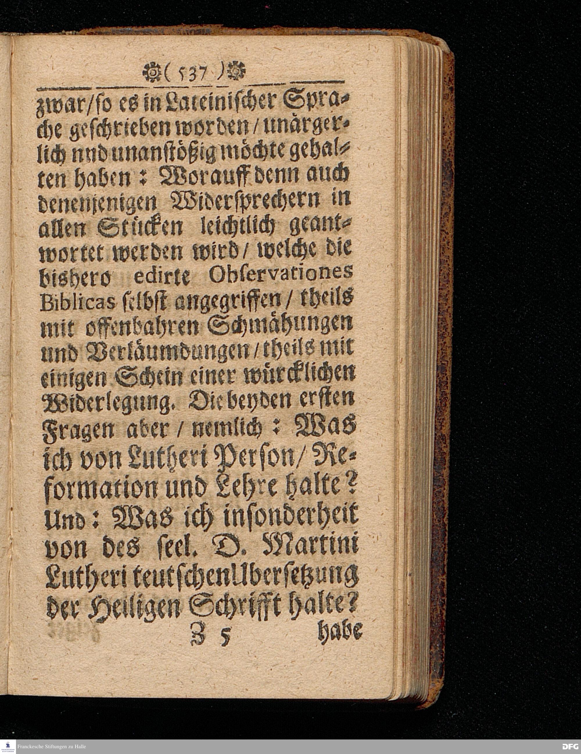 M.Aug.Hermann Franckens Gr.& Or.Lingg.Pr.Ord.& Past.Glauch. Fortsetzung Des Warhafftigen Berichts Von denen Monatlichen OBSERVATIONIBUS BIBLICIS, Da aus mehr denn dreyhundert von Theologis und Philologis bemerckten Schrifftstellen erwiesen wird / Daß die teutsche Ubersetzung des sel.Lutheri aus dem Original=Text eine Verbesserung zulasse. JUNIUS 1695. Halle / Gedruckt bey Christoph Salfelden.