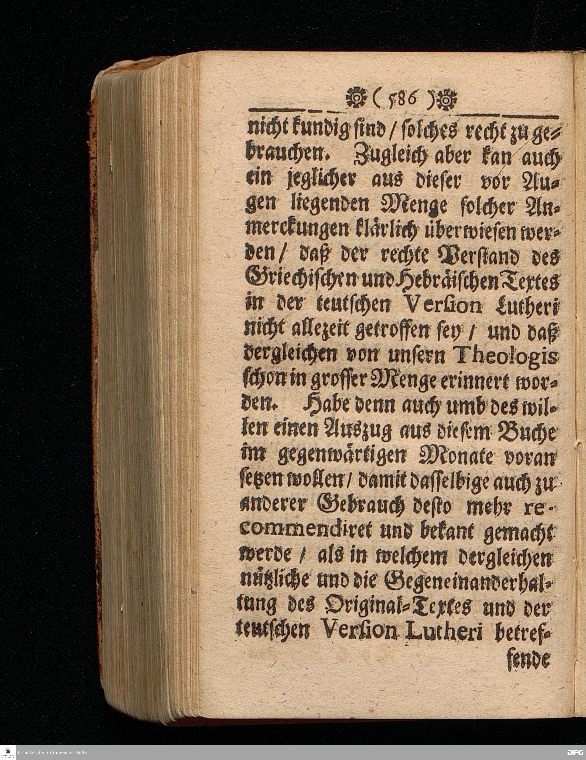 M.Aug.Hermann Franckens Gr.& Or.Lingg.Pr.Ord.& Past.Glauch. Fortsetzung Des Warhafftigen Berichts Von denen Monatlichen OBSERVATIONIBUS BIBLICIS, Da aus mehr denn dreyhundert von Theologis und Philologis bemerckten Schrifftstellen erwiesen wird / Daß die teutsche Ubersetzung des sel.Lutheri aus dem Original=Text eine Verbesserung zulasse. JUNIUS 1695. Halle / Gedruckt bey Christoph Salfelden.