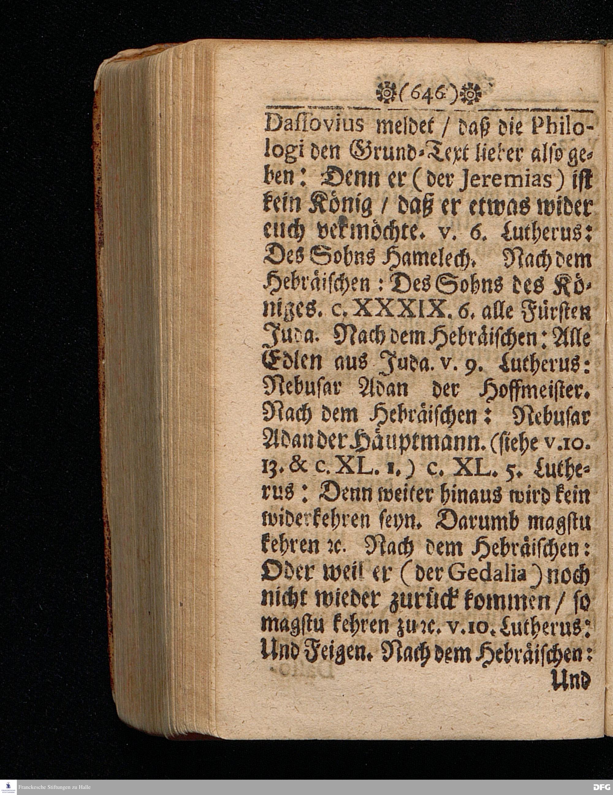 M.Aug.Hermann Franckens Gr.& Or.Lingg.Pr.Ord.& Past.Glauch. Fortsetzung Des Warhafftigen Berichts Von denen Monatlichen OBSERVATIONIBUS BIBLICIS, Da aus mehr denn dreyhundert von Theologis und Philologis bemerckten Schrifftstellen erwiesen wird / Daß die teutsche Ubersetzung des sel.Lutheri aus dem Original=Text eine Verbesserung zulasse. JUNIUS 1695. Halle / Gedruckt bey Christoph Salfelden.