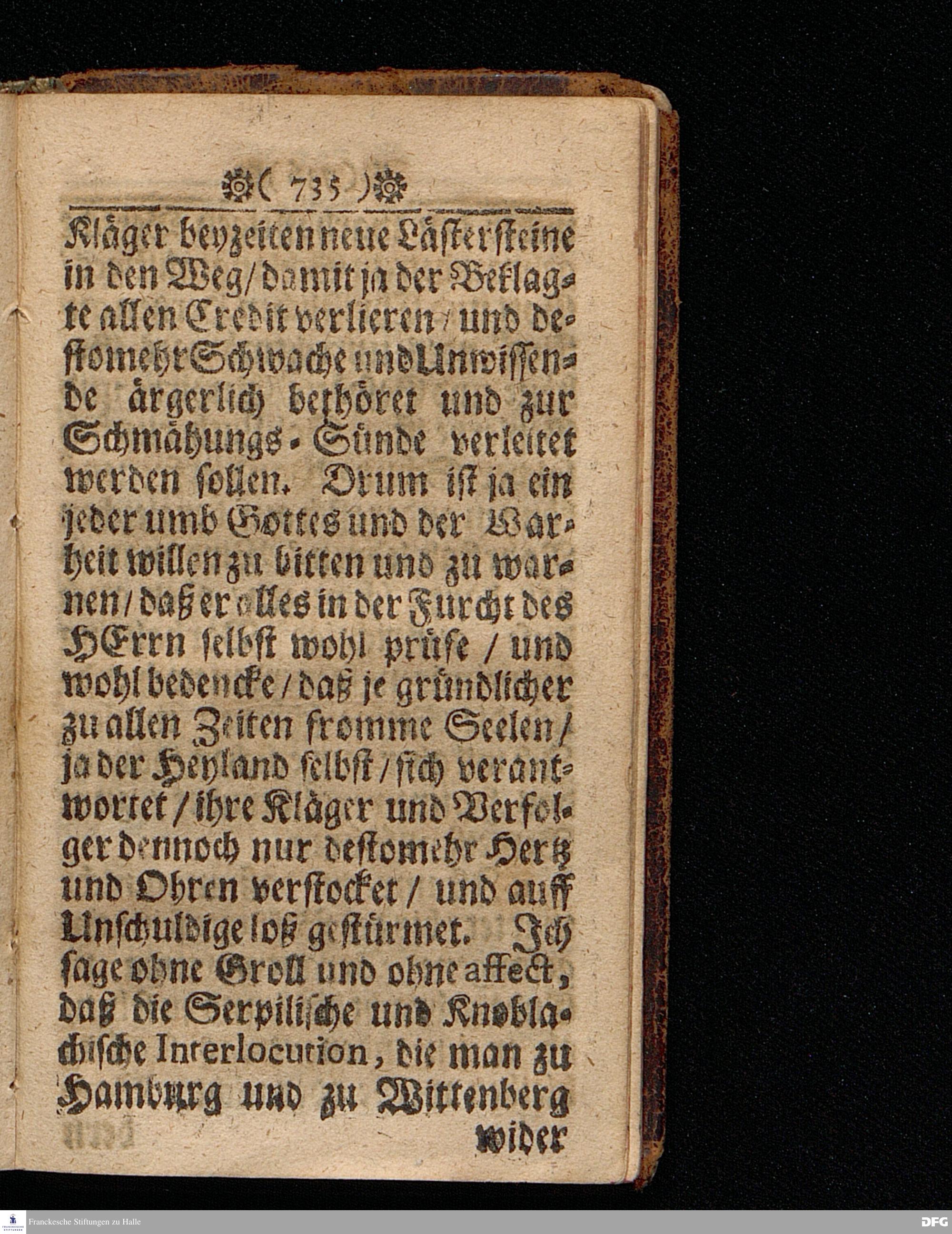 M.Aug.Hermann Franckens Gr.& Or.Lingg.Pr.Ord.& Past.Glauch. Fortsetzung Des warhaftigen Berichts Von denen Monatlichen OBSERVATIONIBUS BIBLICIS, Da noch ferner aus sehr vielen Schrifftstellen erwiesen wird Daß die teutsche Ubersetzung des sel.Lutheri aus dem Original=Text eine Verbesserung zulasse. Nebst dem Beweiß eines Anonymi daß die Hamburgische und Wittenbergische Interlocution Einrede und Klage gegen seine im Majo angefangene Schutz=Rede nicht richtig sey. JULIUS 1695. Halle / Gedruckt bey Christoph Salfelden.