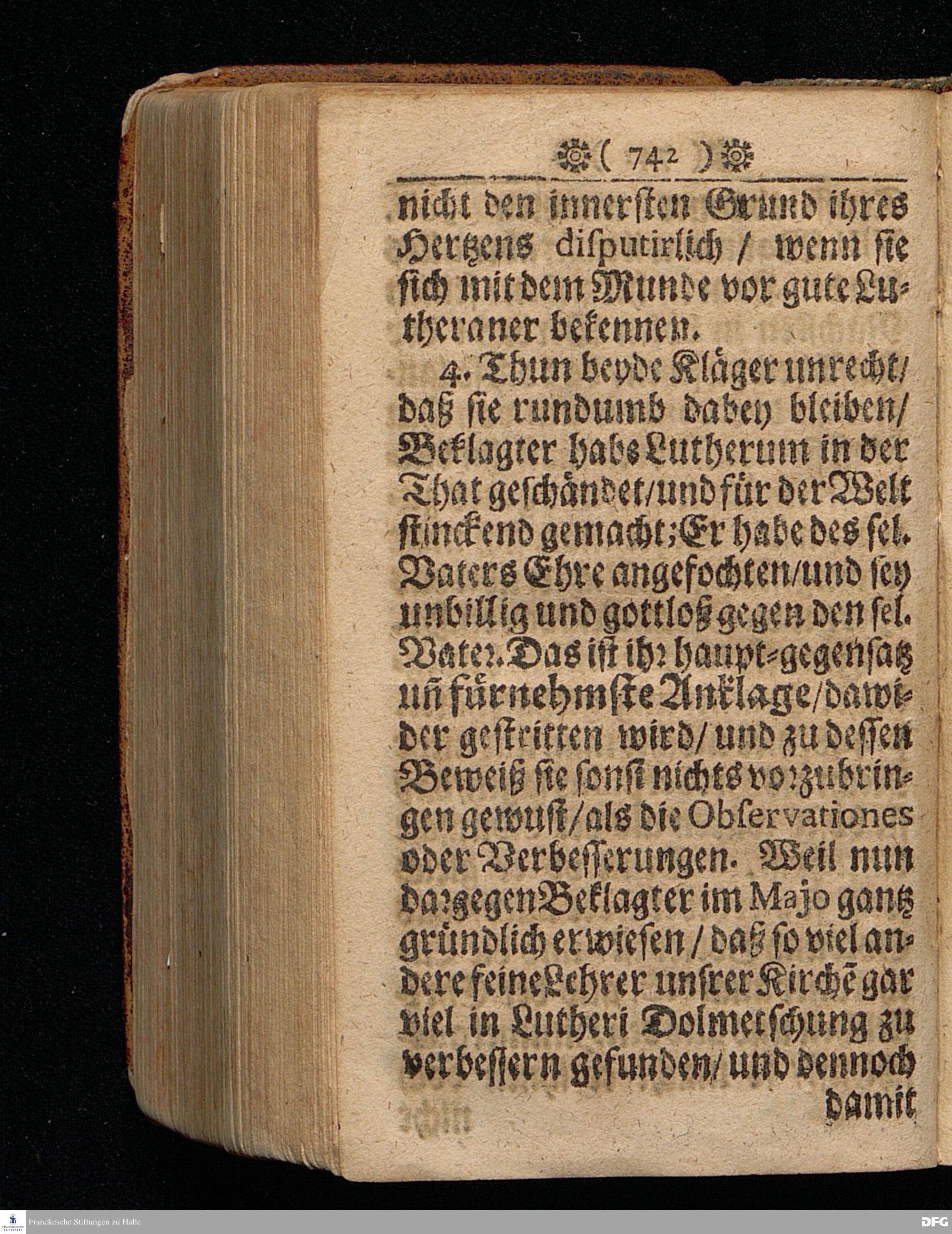 M.Aug.Hermann Franckens Gr.& Or.Lingg.Pr.Ord.& Past.Glauch. Fortsetzung Des warhaftigen Berichts Von denen Monatlichen OBSERVATIONIBUS BIBLICIS, Da noch ferner aus sehr vielen Schrifftstellen erwiesen wird Daß die teutsche Ubersetzung des sel.Lutheri aus dem Original=Text eine Verbesserung zulasse. Nebst dem Beweiß eines Anonymi daß die Hamburgische und Wittenbergische Interlocution Einrede und Klage gegen seine im Majo angefangene Schutz=Rede nicht richtig sey. JULIUS 1695. Halle / Gedruckt bey Christoph Salfelden.