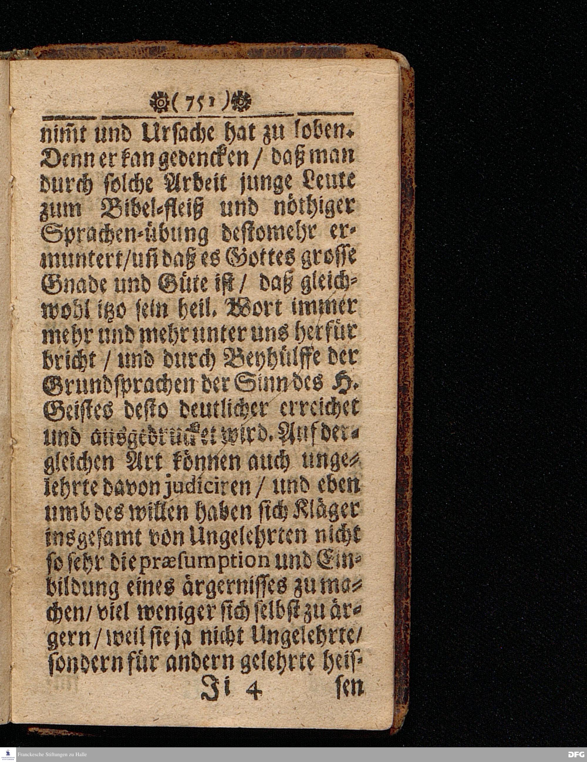 M.Aug.Hermann Franckens Gr.& Or.Lingg.Pr.Ord.& Past.Glauch. Fortsetzung Des warhaftigen Berichts Von denen Monatlichen OBSERVATIONIBUS BIBLICIS, Da noch ferner aus sehr vielen Schrifftstellen erwiesen wird Daß die teutsche Ubersetzung des sel.Lutheri aus dem Original=Text eine Verbesserung zulasse. Nebst dem Beweiß eines Anonymi daß die Hamburgische und Wittenbergische Interlocution Einrede und Klage gegen seine im Majo angefangene Schutz=Rede nicht richtig sey. JULIUS 1695. Halle / Gedruckt bey Christoph Salfelden.