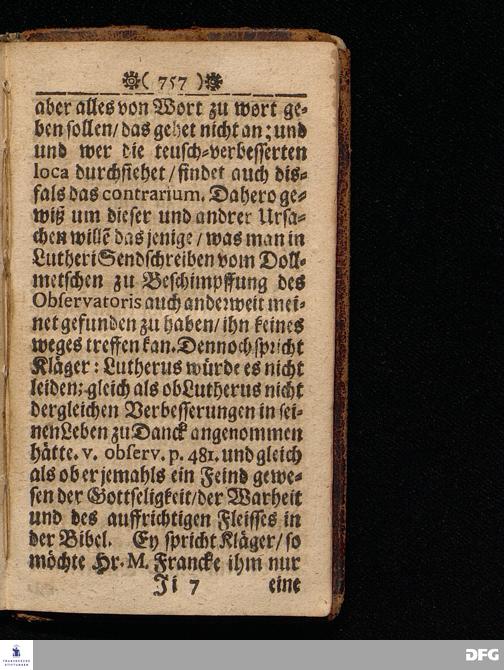 M.Aug.Hermann Franckens Gr.& Or.Lingg.Pr.Ord.& Past.Glauch. Fortsetzung Des warhaftigen Berichts Von denen Monatlichen OBSERVATIONIBUS BIBLICIS, Da noch ferner aus sehr vielen Schrifftstellen erwiesen wird Daß die teutsche Ubersetzung des sel.Lutheri aus dem Original=Text eine Verbesserung zulasse. Nebst dem Beweiß eines Anonymi daß die Hamburgische und Wittenbergische Interlocution Einrede und Klage gegen seine im Majo angefangene Schutz=Rede nicht richtig sey. JULIUS 1695. Halle / Gedruckt bey Christoph Salfelden.