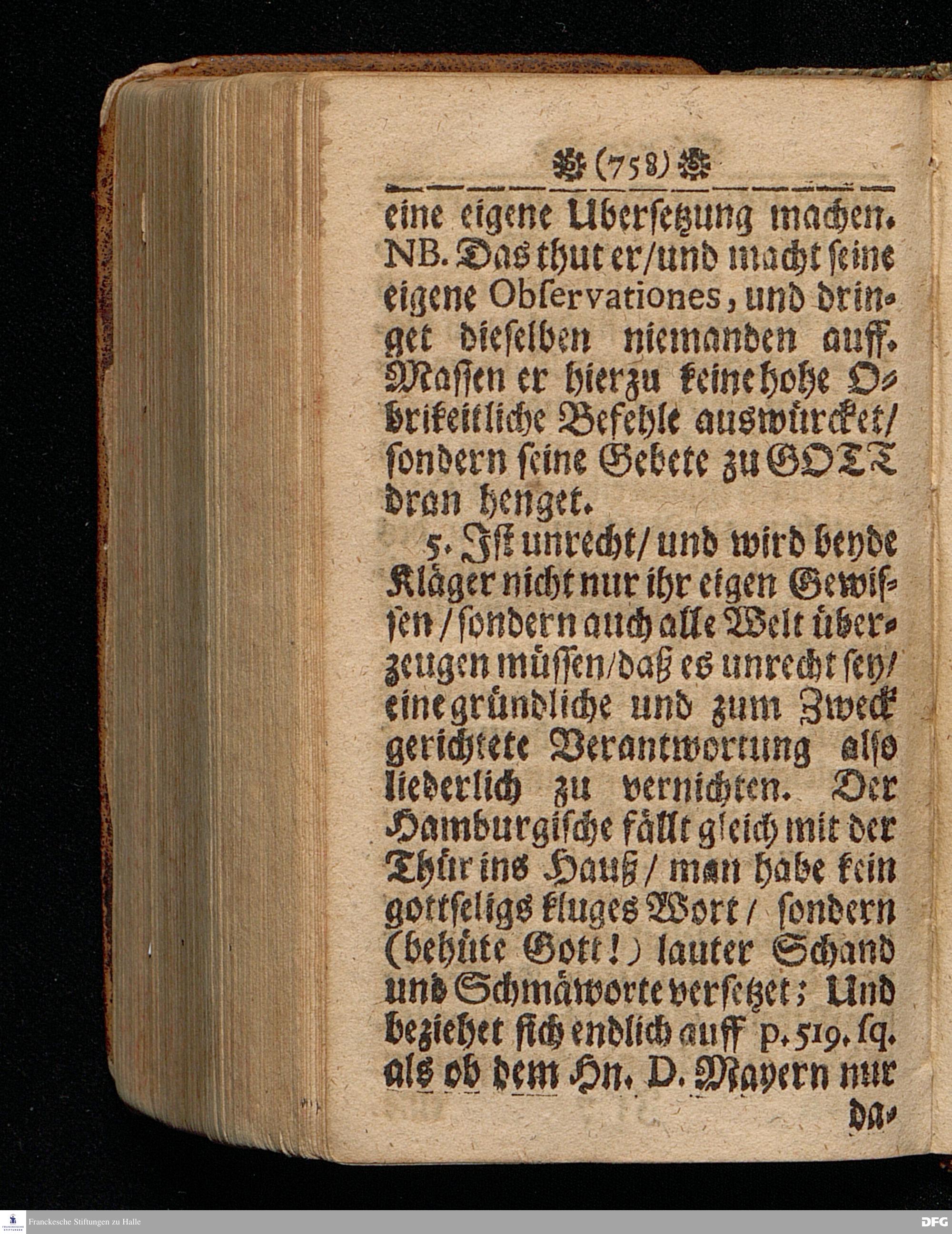 M.Aug.Hermann Franckens Gr.& Or.Lingg.Pr.Ord.& Past.Glauch. Fortsetzung Des warhaftigen Berichts Von denen Monatlichen OBSERVATIONIBUS BIBLICIS, Da noch ferner aus sehr vielen Schrifftstellen erwiesen wird Daß die teutsche Ubersetzung des sel.Lutheri aus dem Original=Text eine Verbesserung zulasse. Nebst dem Beweiß eines Anonymi daß die Hamburgische und Wittenbergische Interlocution Einrede und Klage gegen seine im Majo angefangene Schutz=Rede nicht richtig sey. JULIUS 1695. Halle / Gedruckt bey Christoph Salfelden.