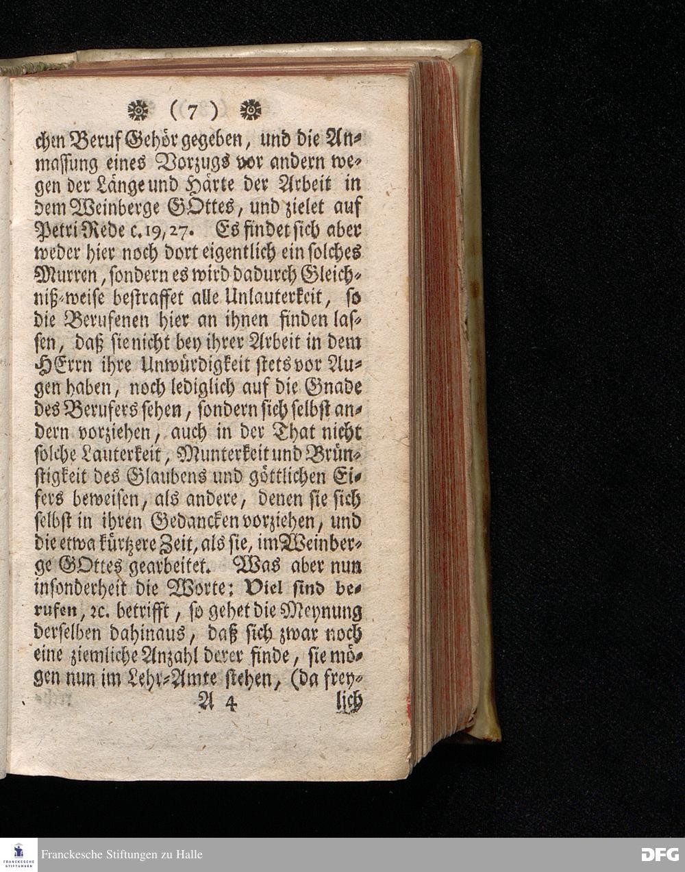 Erklärung des Spruchs Matth. 20 / 16. [Viele sind berufen / aber wenig sind auserwählet.] Auf dem Wäysen=Hause zu Glaucha An Halle Den 8.Jul.1711. ertheilet Von August Hermann Francken / S.Th.P.Ord.& Past.Glauch. Dritte Auflage. HALLE, In Verlegung des Wäysen=Hauses. MDCCXXIII.