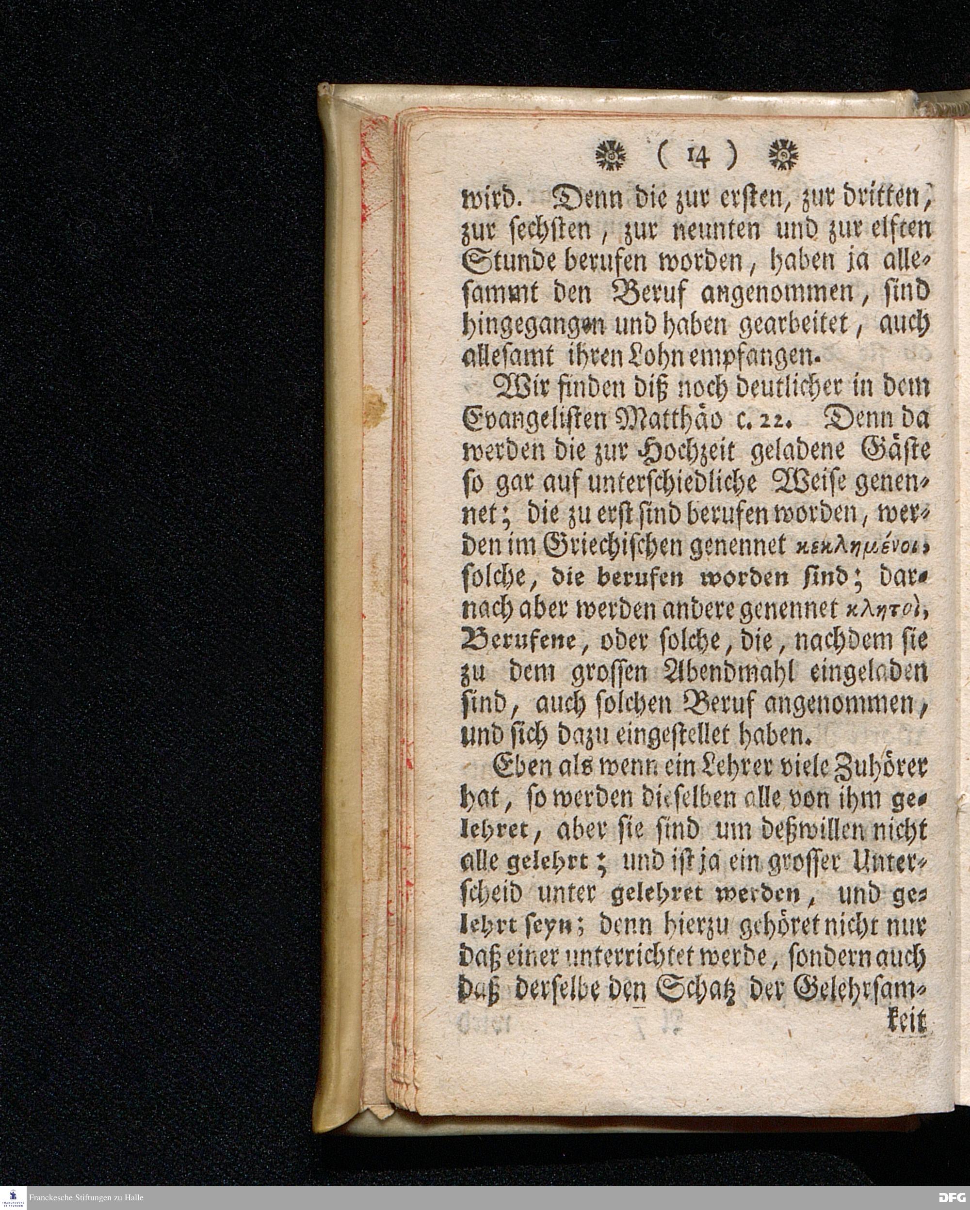 Erklärung des Spruchs Matth. 20 / 16. [Viele sind berufen / aber wenig sind auserwählet.] Auf dem Wäysen=Hause zu Glaucha An Halle Den 8.Jul.1711. ertheilet Von August Hermann Francken / S.Th.P.Ord.& Past.Glauch. Dritte Auflage. HALLE, In Verlegung des Wäysen=Hauses. MDCCXXIII.