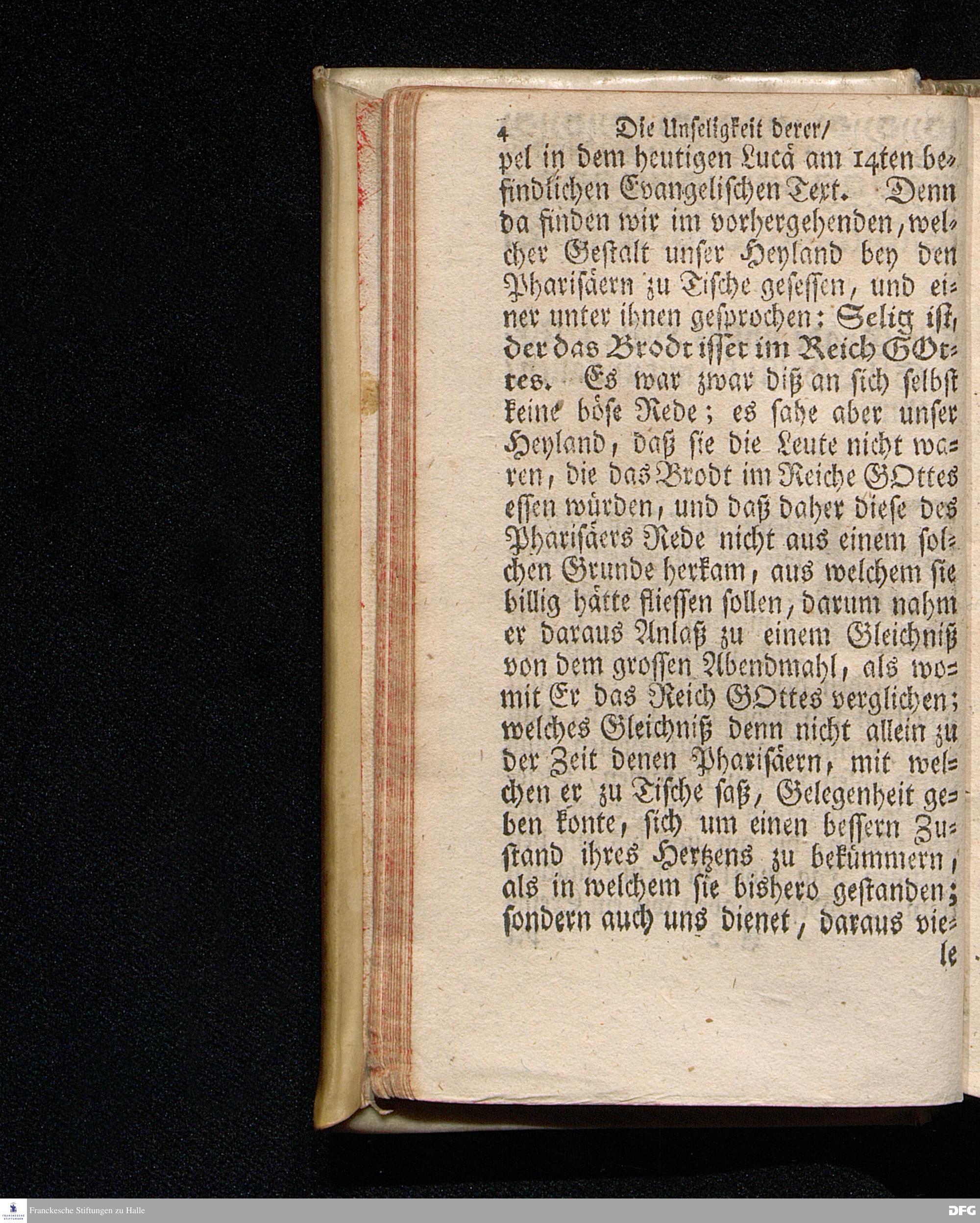 Die Unseligkeit Derer / Die vergebens zu dem Abendmahl GOttes geladen sind / Aus dem Evangelischen Text Luc.XIV, 16--24. Am II.Sonntag nach Trinit. 1715. In der S.Ulrichs=Kirche zu Halle vorgestellet von August Hermann Francken / S.Th.Prof.& Past.zu S.Ulrich und des Gymnasii Scholarcha. Der Jugend in denen zum Wäysenhause gehörigen Schulen nach gehaltenem Examine ausgetheilet d.8.Jul.1719. Andere Auflage. HALLE / In Verlegung des Wäysenhauses. 1729.