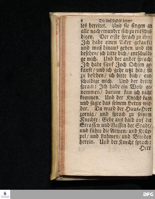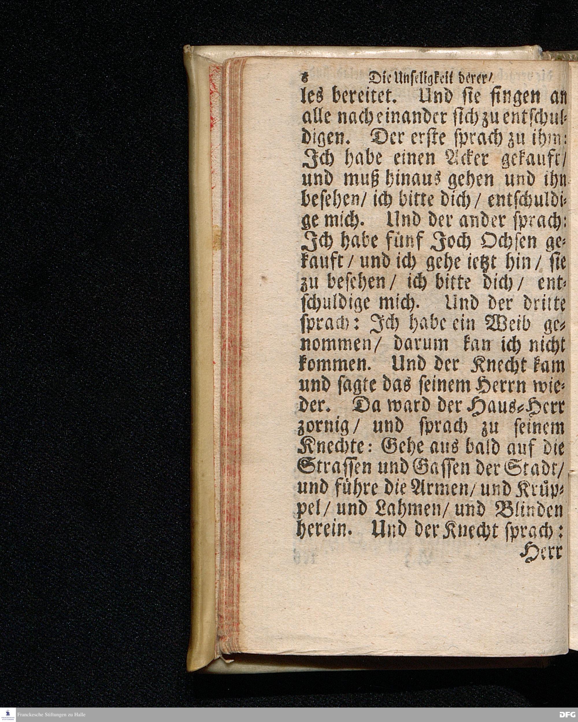Die Unseligkeit Derer / Die vergebens zu dem Abendmahl GOttes geladen sind / Aus dem Evangelischen Text Luc.XIV, 16--24. Am II.Sonntag nach Trinit. 1715. In der S.Ulrichs=Kirche zu Halle vorgestellet von August Hermann Francken / S.Th.Prof.& Past.zu S.Ulrich und des Gymnasii Scholarcha. Der Jugend in denen zum Wäysenhause gehörigen Schulen nach gehaltenem Examine ausgetheilet d.8.Jul.1719. Andere Auflage. HALLE / In Verlegung des Wäysenhauses. 1729.