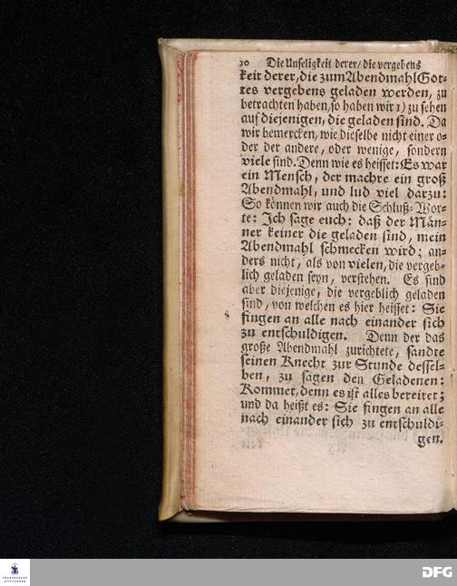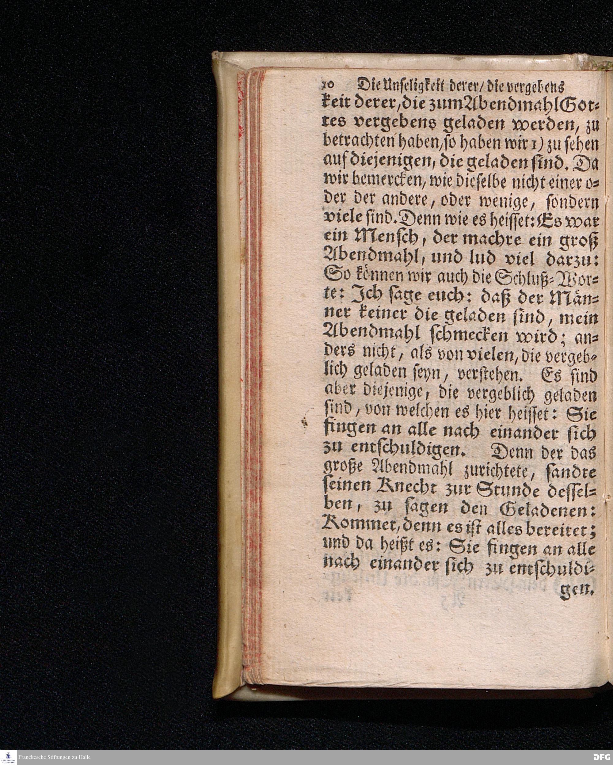 Die Unseligkeit Derer / Die vergebens zu dem Abendmahl GOttes geladen sind / Aus dem Evangelischen Text Luc.XIV, 16--24. Am II.Sonntag nach Trinit. 1715. In der S.Ulrichs=Kirche zu Halle vorgestellet von August Hermann Francken / S.Th.Prof.& Past.zu S.Ulrich und des Gymnasii Scholarcha. Der Jugend in denen zum Wäysenhause gehörigen Schulen nach gehaltenem Examine ausgetheilet d.8.Jul.1719. Andere Auflage. HALLE / In Verlegung des Wäysenhauses. 1729.