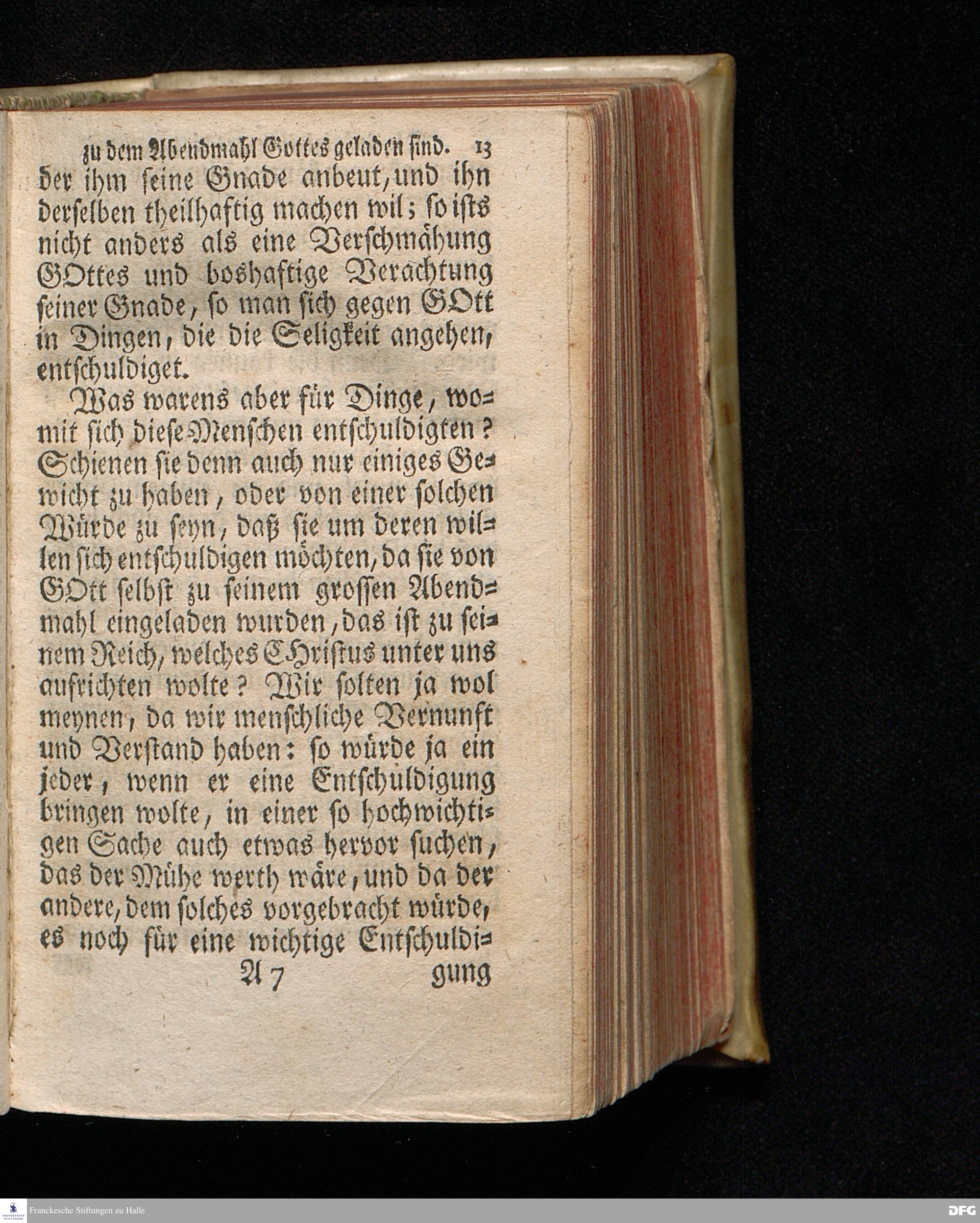 Die Unseligkeit Derer / Die vergebens zu dem Abendmahl GOttes geladen sind / Aus dem Evangelischen Text Luc.XIV, 16--24. Am II.Sonntag nach Trinit. 1715. In der S.Ulrichs=Kirche zu Halle vorgestellet von August Hermann Francken / S.Th.Prof.& Past.zu S.Ulrich und des Gymnasii Scholarcha. Der Jugend in denen zum Wäysenhause gehörigen Schulen nach gehaltenem Examine ausgetheilet d.8.Jul.1719. Andere Auflage. HALLE / In Verlegung des Wäysenhauses. 1729.