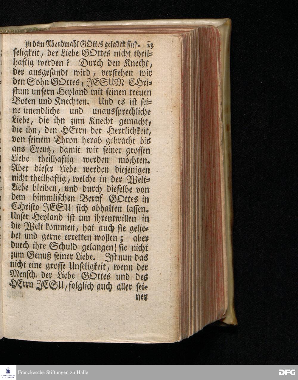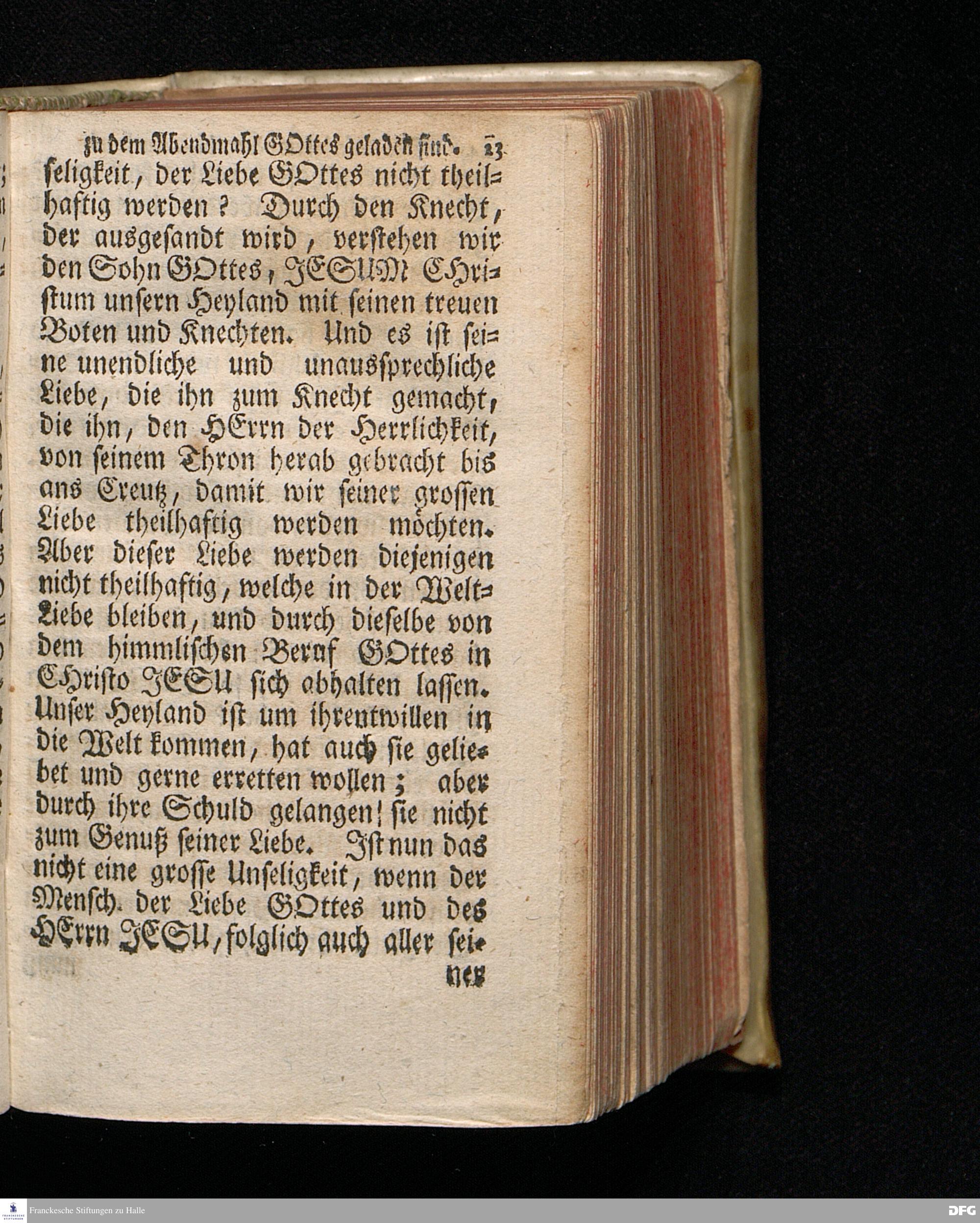 Die Unseligkeit Derer / Die vergebens zu dem Abendmahl GOttes geladen sind / Aus dem Evangelischen Text Luc.XIV, 16--24. Am II.Sonntag nach Trinit. 1715. In der S.Ulrichs=Kirche zu Halle vorgestellet von August Hermann Francken / S.Th.Prof.& Past.zu S.Ulrich und des Gymnasii Scholarcha. Der Jugend in denen zum Wäysenhause gehörigen Schulen nach gehaltenem Examine ausgetheilet d.8.Jul.1719. Andere Auflage. HALLE / In Verlegung des Wäysenhauses. 1729.