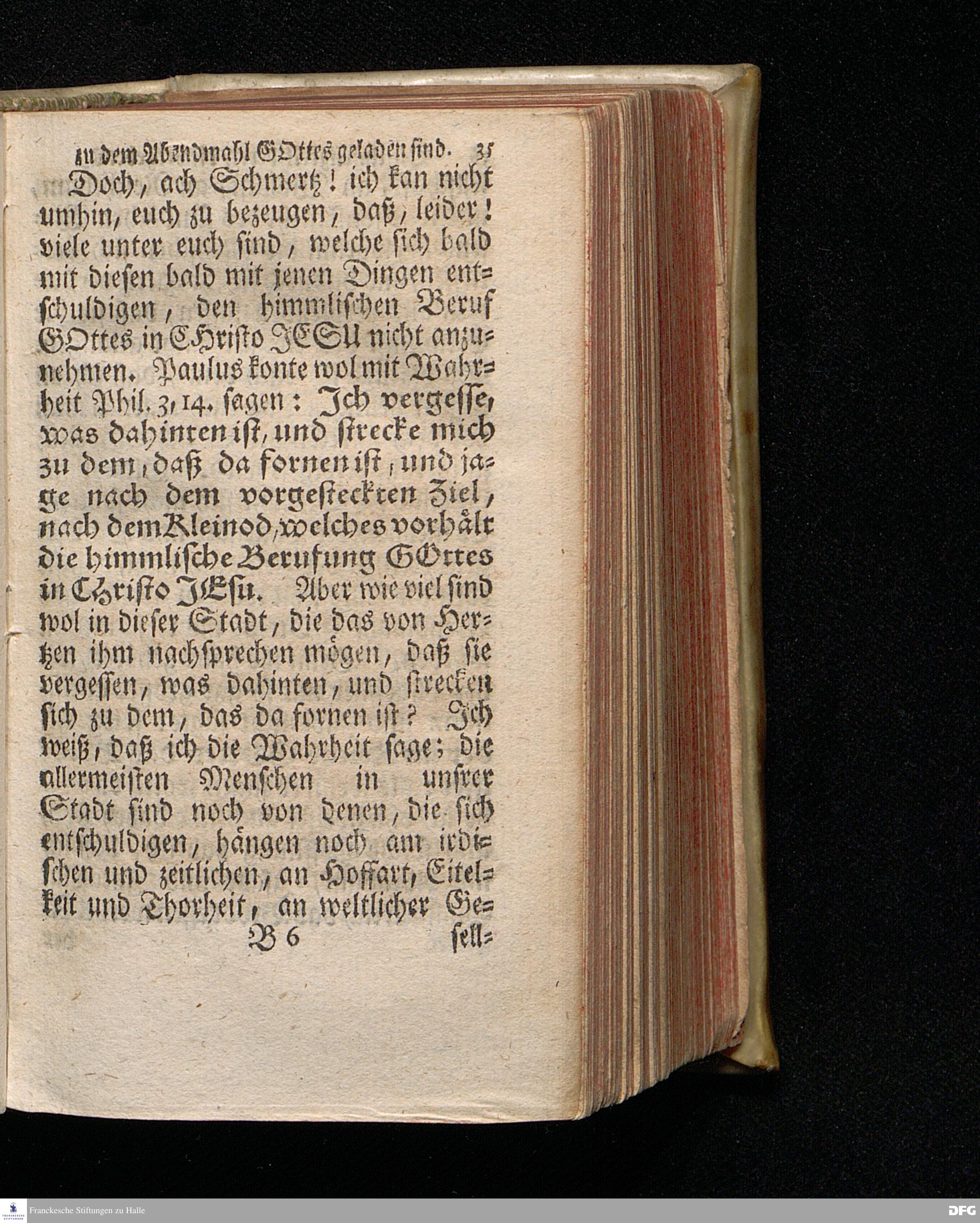 Die Unseligkeit Derer / Die vergebens zu dem Abendmahl GOttes geladen sind / Aus dem Evangelischen Text Luc.XIV, 16--24. Am II.Sonntag nach Trinit. 1715. In der S.Ulrichs=Kirche zu Halle vorgestellet von August Hermann Francken / S.Th.Prof.& Past.zu S.Ulrich und des Gymnasii Scholarcha. Der Jugend in denen zum Wäysenhause gehörigen Schulen nach gehaltenem Examine ausgetheilet d.8.Jul.1719. Andere Auflage. HALLE / In Verlegung des Wäysenhauses. 1729.