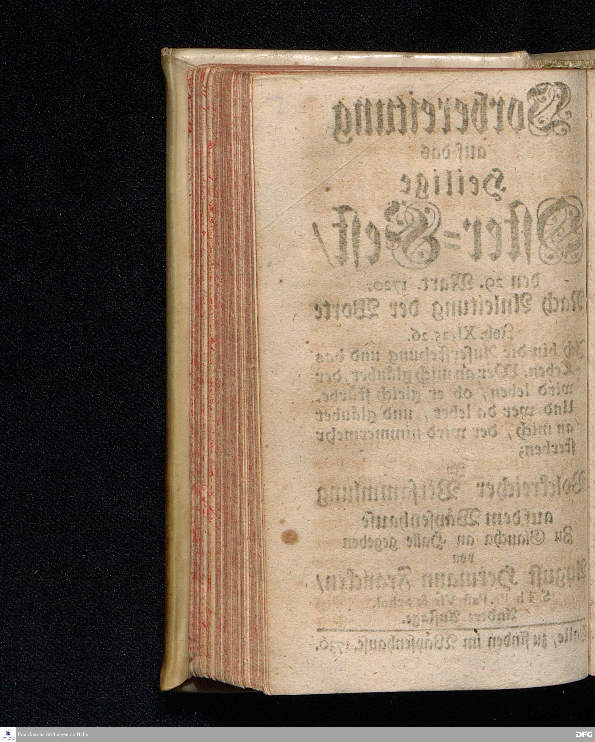 Vorbereitung auf das Heilige Oster=Fest / den 29.Mart. 1720. Nach Anleitung der Worte Joh.XI, 25.26. [Bibelzitat.] In Volckreicher Versammlung auf dem Wäysenhause Zu Glaucha an Halle gegeben von August Hermann Francken / S.Th.Pr.Past.Vlr.& Schol. Andere Auflage. Halle, zu finden im Wäysenhause. 1730.