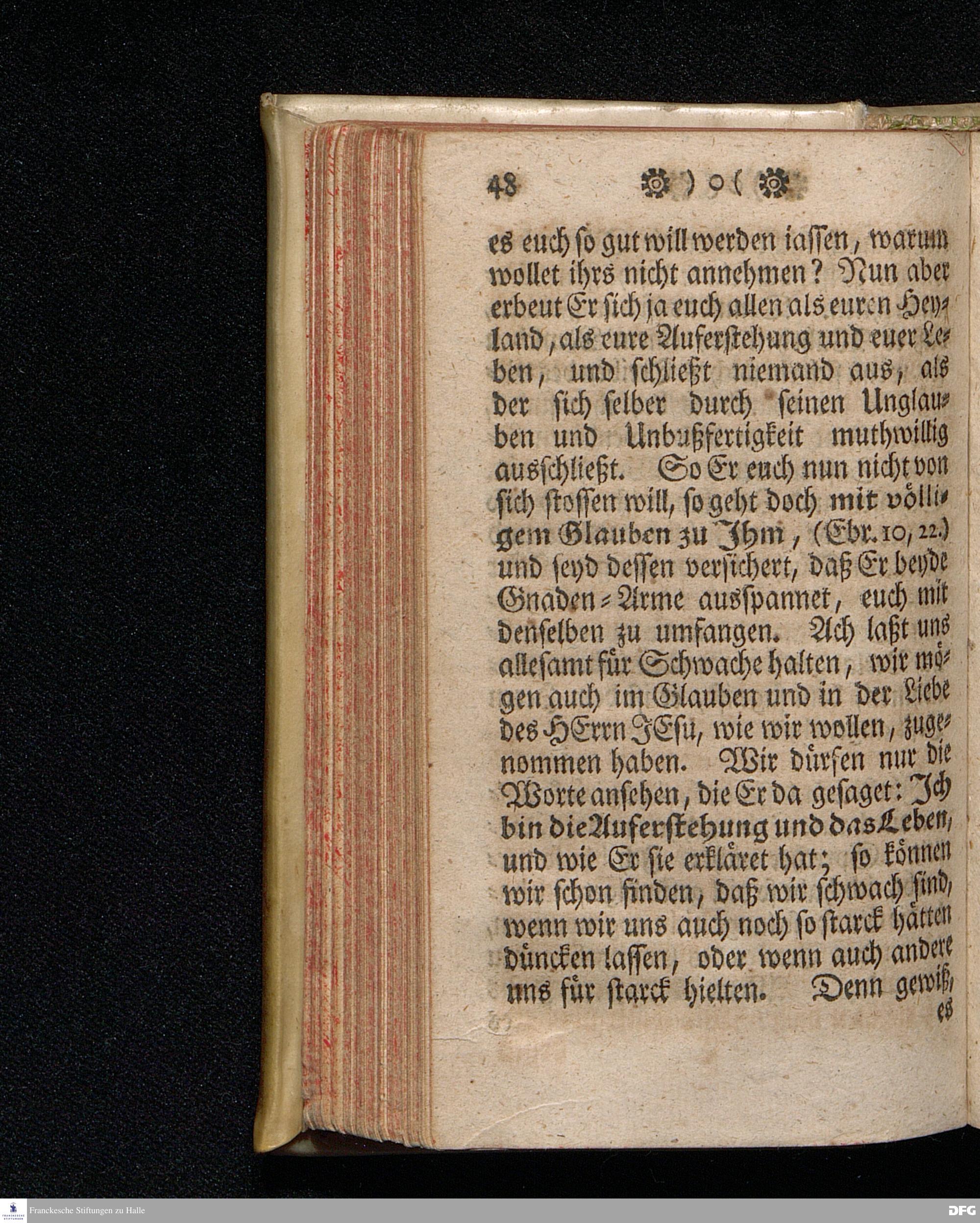 Vorbereitung auf das Heilige Oster=Fest / den 29.Mart. 1720. Nach Anleitung der Worte Joh.XI, 25.26. [Bibelzitat.] In Volckreicher Versammlung auf dem Wäysenhause Zu Glaucha an Halle gegeben von August Hermann Francken / S.Th.Pr.Past.Vlr.& Schol. Andere Auflage. Halle, zu finden im Wäysenhause. 1730.