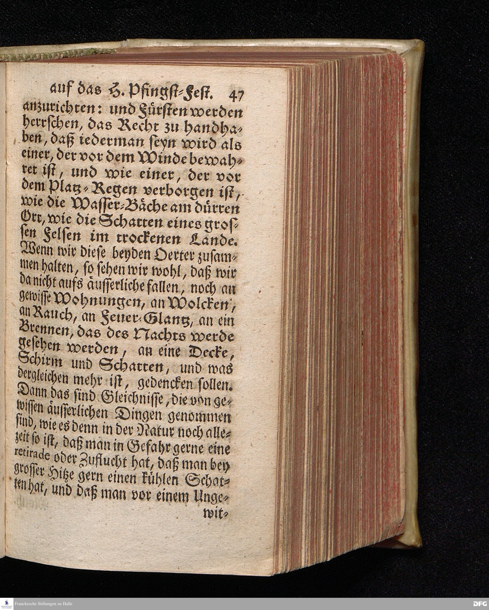 Vorbereitung auf das Heilige Pfingst=Fest / über Jes.IV, 2--6. den 18ten Mai. MDCCXX. In volckreicher Versammlung auf dem Wäysenhause zu Glaucha an Halle ertheilet von August Hermann Francken / S.Theol.Prof.Past.Ulr.& Schol. HALLE, In Verlegung des Wäysenhauses, MDCCXXII.