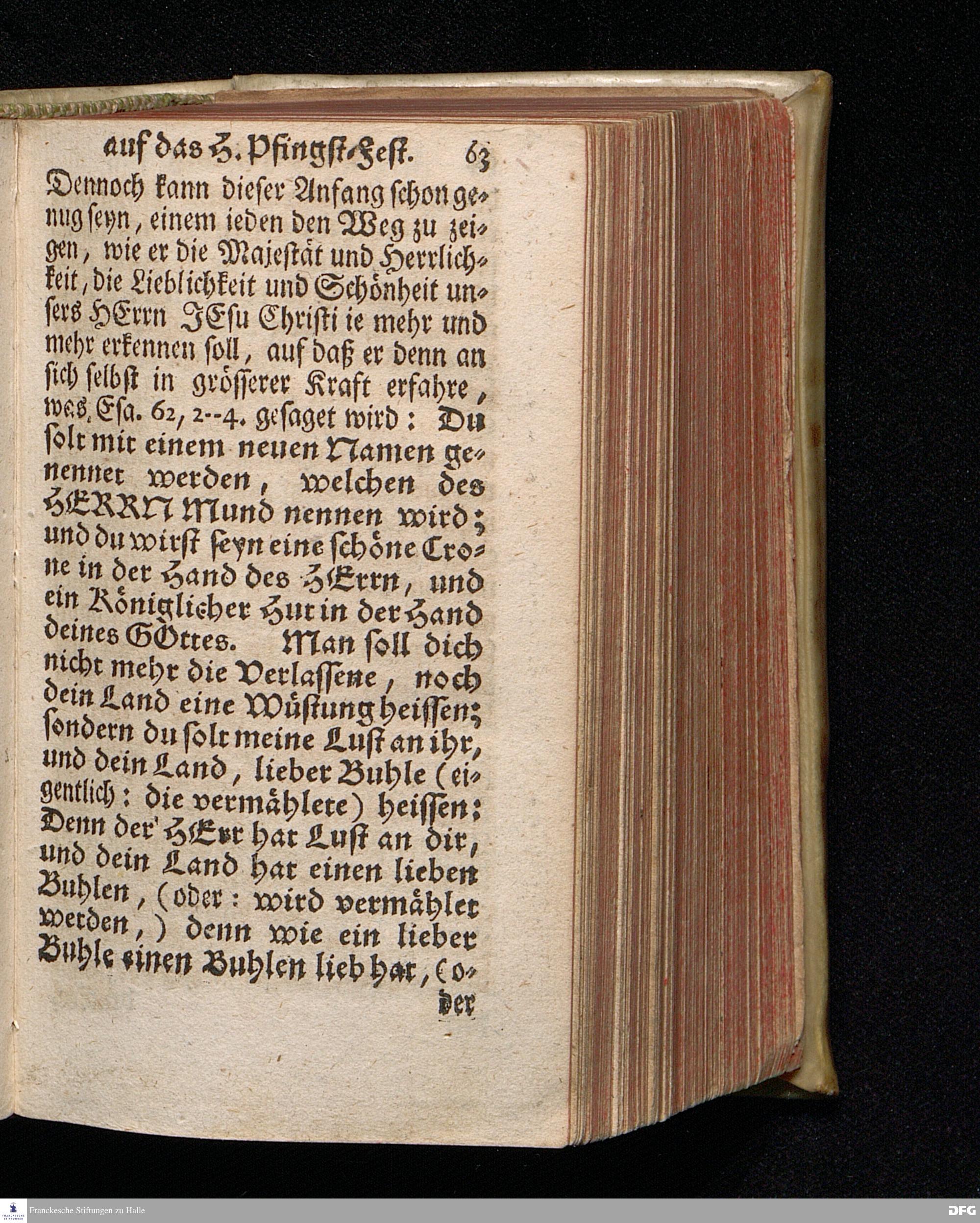 Vorbereitung auf das Heilige Pfingst=Fest / über Jes.IV, 2--6. den 18ten Mai. MDCCXX. In volckreicher Versammlung auf dem Wäysenhause zu Glaucha an Halle ertheilet von August Hermann Francken / S.Theol.Prof.Past.Ulr.& Schol. HALLE, In Verlegung des Wäysenhauses, MDCCXXII.