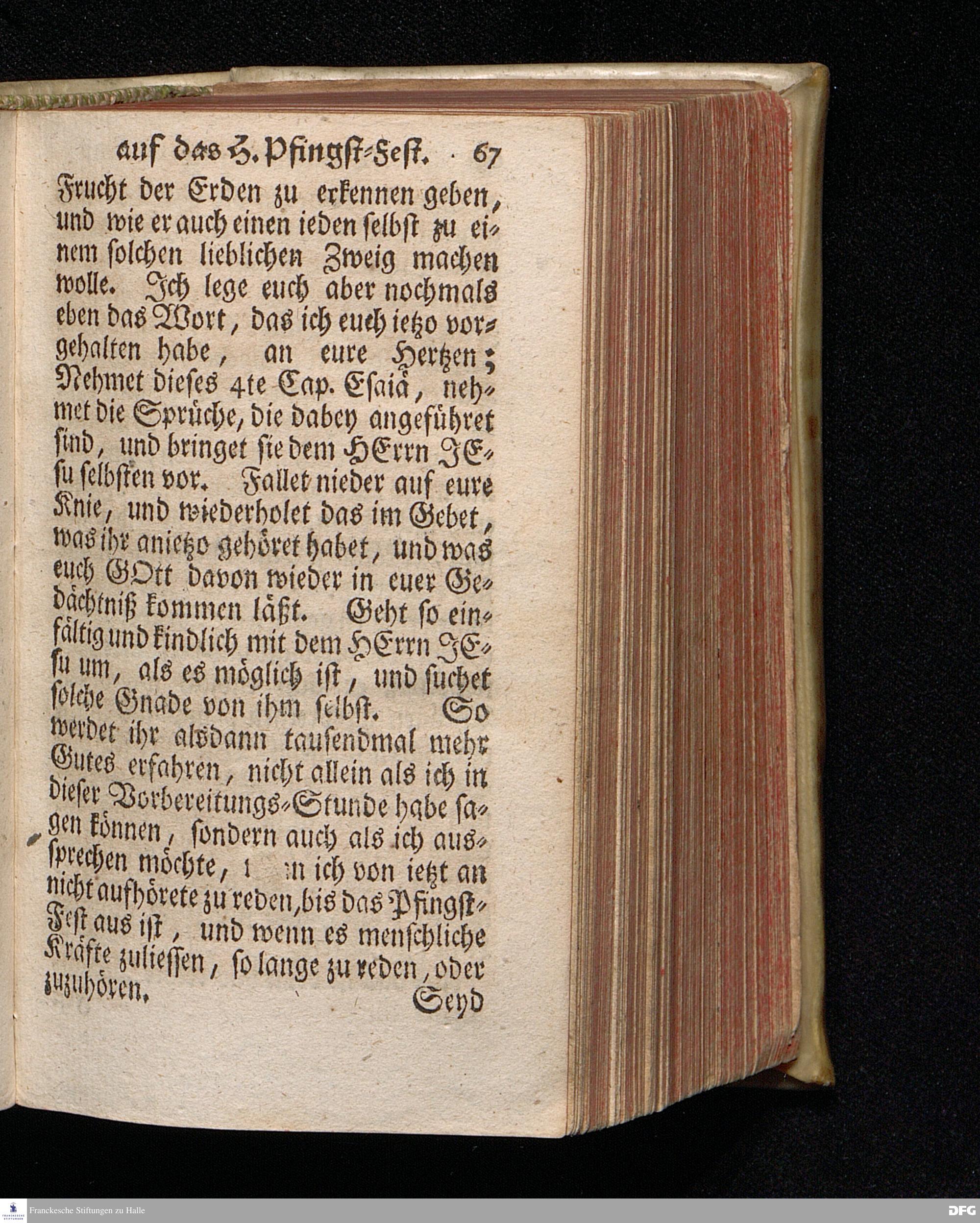 Vorbereitung auf das Heilige Pfingst=Fest / über Jes.IV, 2--6. den 18ten Mai. MDCCXX. In volckreicher Versammlung auf dem Wäysenhause zu Glaucha an Halle ertheilet von August Hermann Francken / S.Theol.Prof.Past.Ulr.& Schol. HALLE, In Verlegung des Wäysenhauses, MDCCXXII.