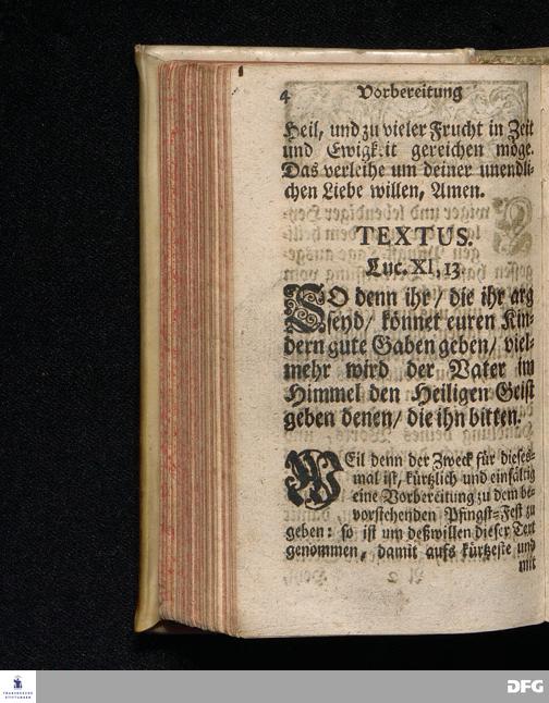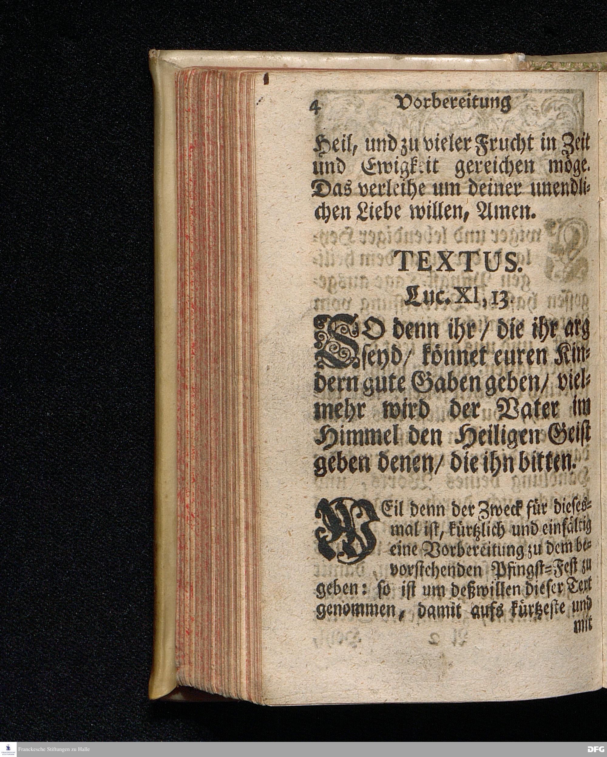 Vorbereitung auf das Heilige Pfingst=Fest / Den 26ten Maji 1719. nach Anleitung der Worte Luc.XI, 13. [Bibelzitat.] in Volckreicher Versammlung Auf dem Wäysen=Hause zu Glaucha an Halle gegeben von August Hermann Francken / SS.Theol.Prof.Past.Vlr.& Scholarcha. Die II.Auflage. HALLE, In Verlegung des Wäysen=Hauses. 1730.