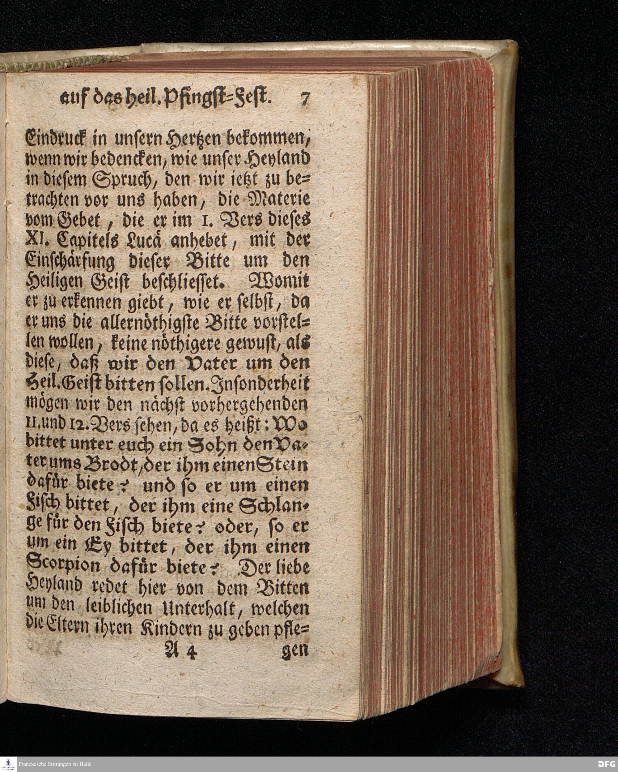 Vorbereitung auf das Heilige Pfingst=Fest / Den 26ten Maji 1719. nach Anleitung der Worte Luc.XI, 13. [Bibelzitat.] in Volckreicher Versammlung Auf dem Wäysen=Hause zu Glaucha an Halle gegeben von August Hermann Francken / SS.Theol.Prof.Past.Vlr.& Scholarcha. Die II.Auflage. HALLE, In Verlegung des Wäysen=Hauses. 1730.