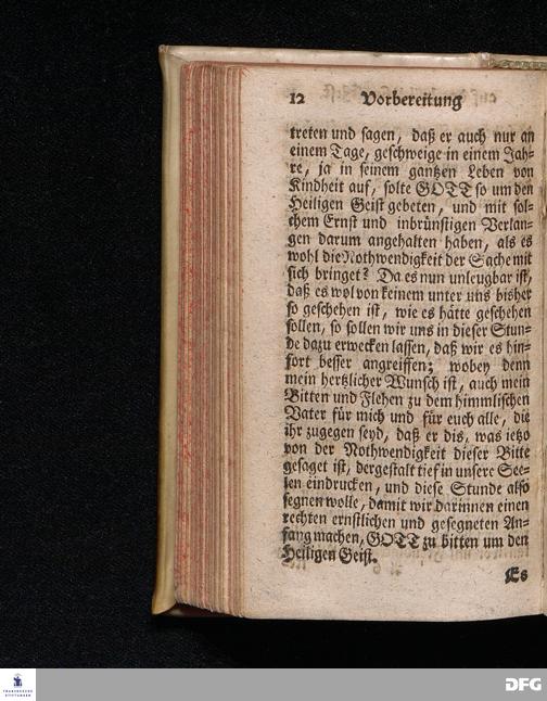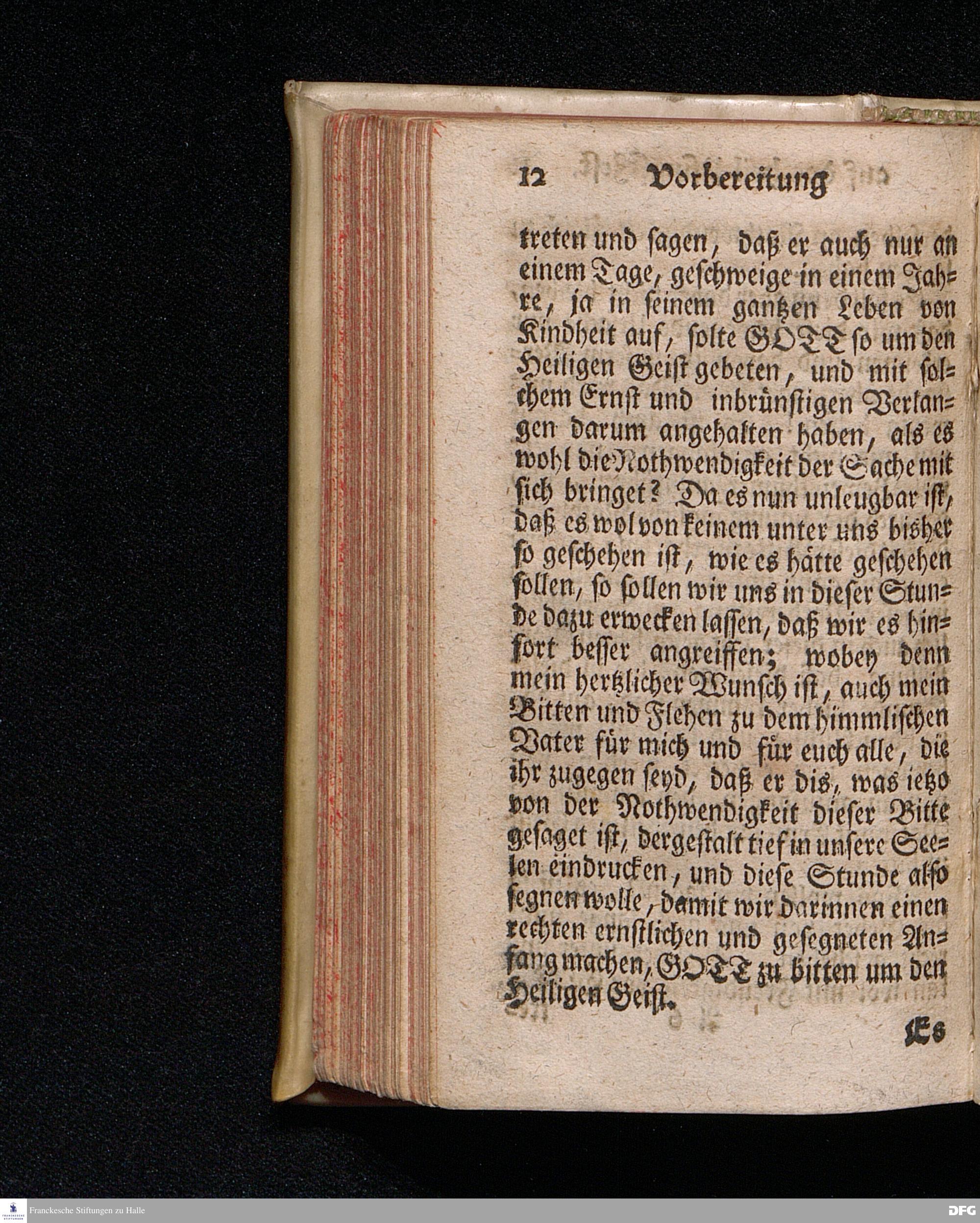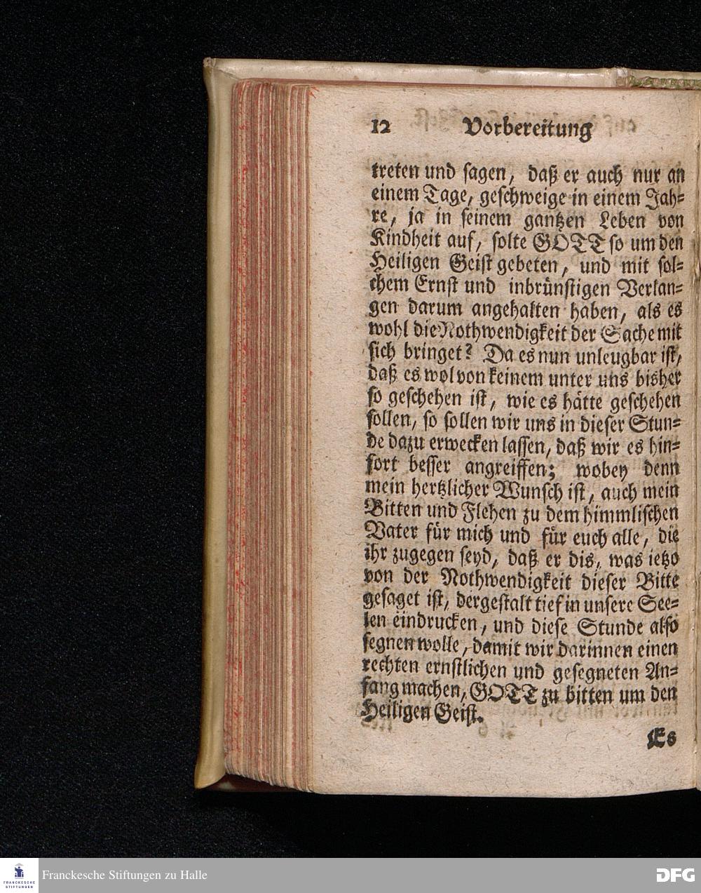 Vorbereitung auf das Heilige Pfingst=Fest / Den 26ten Maji 1719. nach Anleitung der Worte Luc.XI, 13. [Bibelzitat.] in Volckreicher Versammlung Auf dem Wäysen=Hause zu Glaucha an Halle gegeben von August Hermann Francken / SS.Theol.Prof.Past.Vlr.& Scholarcha. Die II.Auflage. HALLE, In Verlegung des Wäysen=Hauses. 1730.
