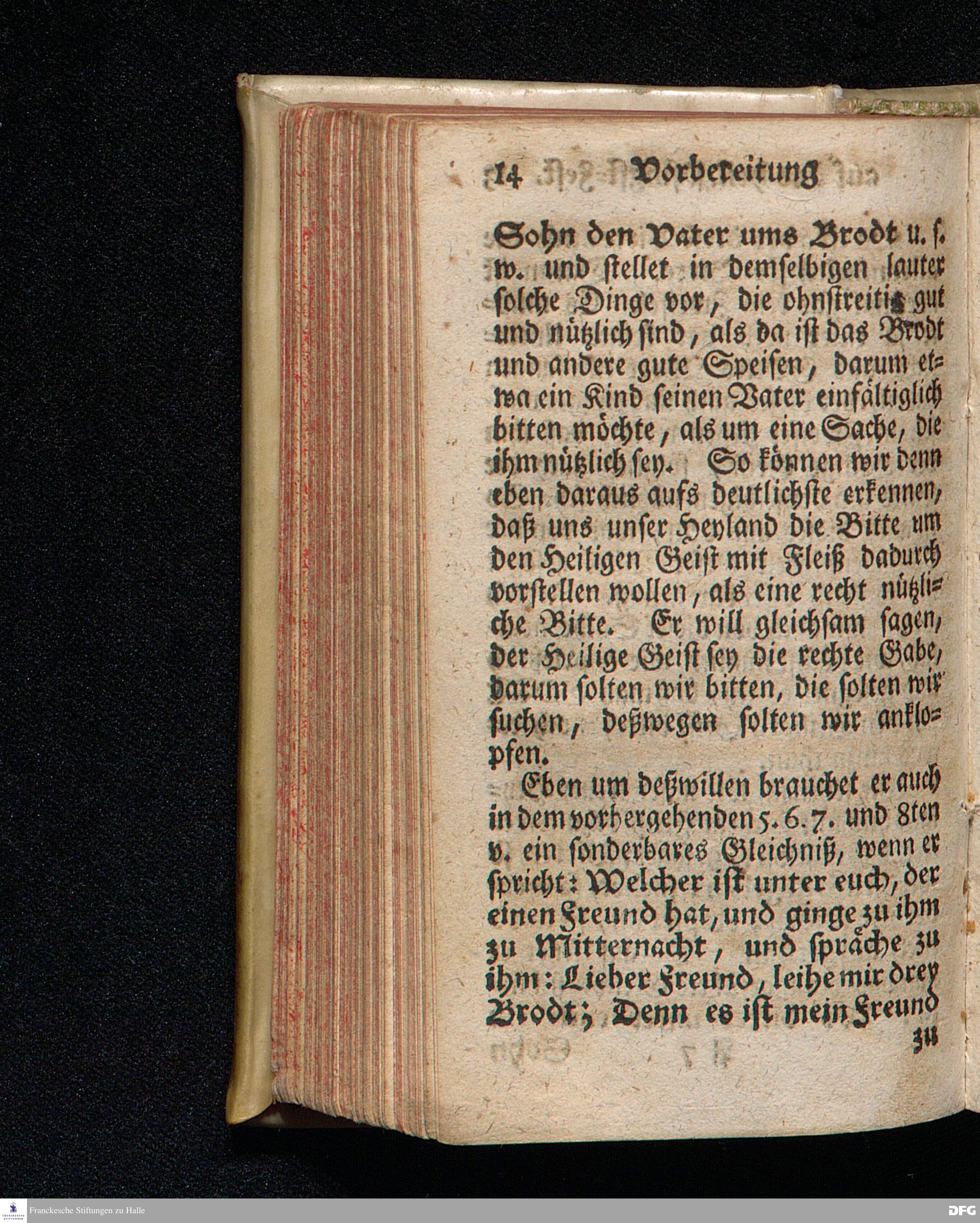Vorbereitung auf das Heilige Pfingst=Fest / Den 26ten Maji 1719. nach Anleitung der Worte Luc.XI, 13. [Bibelzitat.] in Volckreicher Versammlung Auf dem Wäysen=Hause zu Glaucha an Halle gegeben von August Hermann Francken / SS.Theol.Prof.Past.Vlr.& Scholarcha. Die II.Auflage. HALLE, In Verlegung des Wäysen=Hauses. 1730.