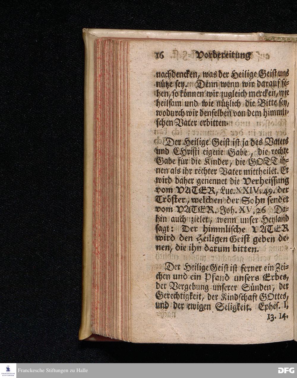 Vorbereitung auf das Heilige Pfingst=Fest / Den 26ten Maji 1719. nach Anleitung der Worte Luc.XI, 13. [Bibelzitat.] in Volckreicher Versammlung Auf dem Wäysen=Hause zu Glaucha an Halle gegeben von August Hermann Francken / SS.Theol.Prof.Past.Vlr.& Scholarcha. Die II.Auflage. HALLE, In Verlegung des Wäysen=Hauses. 1730.