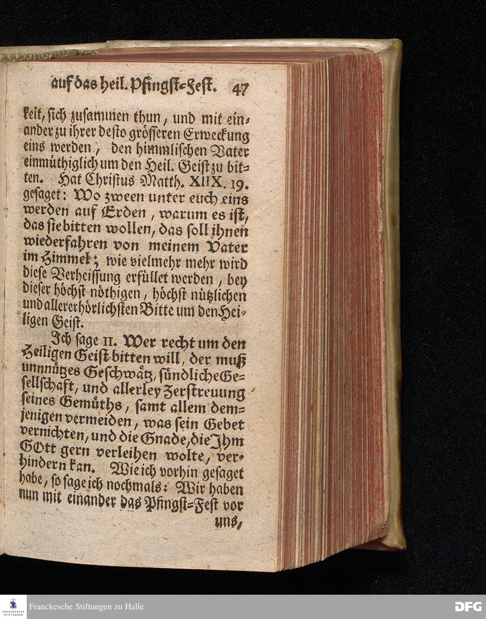 Vorbereitung auf das Heilige Pfingst=Fest / Den 26ten Maji 1719. nach Anleitung der Worte Luc.XI, 13. [Bibelzitat.] in Volckreicher Versammlung Auf dem Wäysen=Hause zu Glaucha an Halle gegeben von August Hermann Francken / SS.Theol.Prof.Past.Vlr.& Scholarcha. Die II.Auflage. HALLE, In Verlegung des Wäysen=Hauses. 1730.