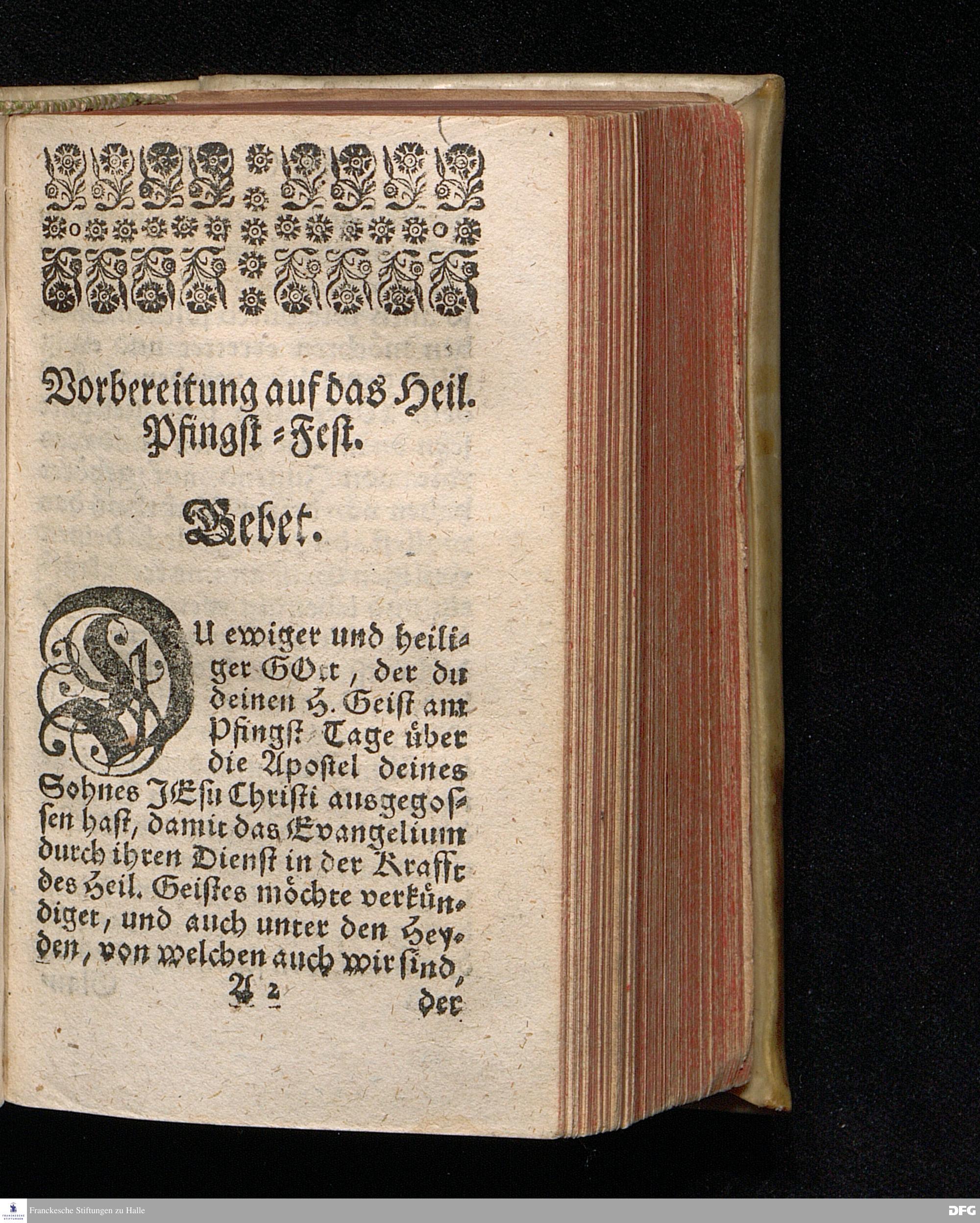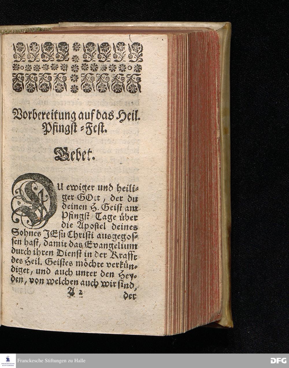 Vorbereitung auf das Heilige Pfingst=Fest / nach Anleitung Der Worte Pauli 1.Cor.XII,3. [Bibelzitat.] in öffentlicher Versammlung auf dem Wäysen=Hause zu Glaucha an Halle, den 7.Jun.1710. ertheilet Von August Hermann Francken / S.Theol.Prof.Ord.und Past.zu St.Ulrich, und des Gymnasii Scholarcha. Andere Auflage. HALLE, in Verlegung des Wäysen=Hauses. MDCCXXIII.