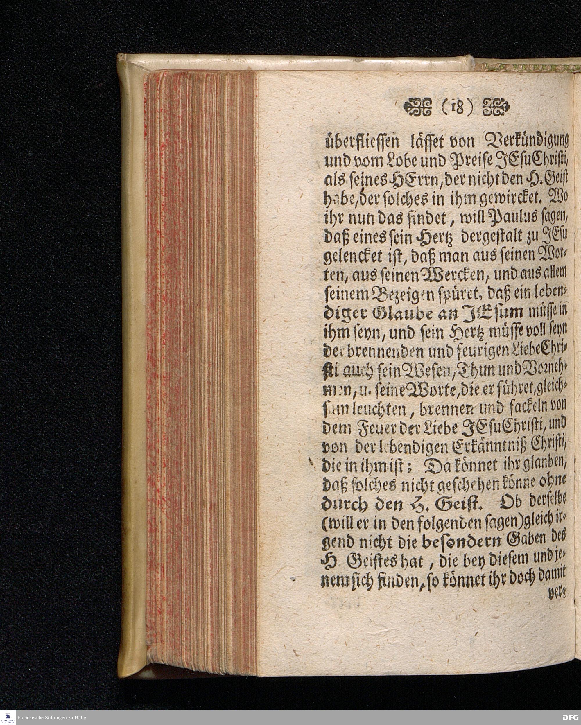 Vorbereitung auf das Heilige Pfingst=Fest / nach Anleitung Der Worte Pauli 1.Cor.XII,3. [Bibelzitat.] in öffentlicher Versammlung auf dem Wäysen=Hause zu Glaucha an Halle, den 7.Jun.1710. ertheilet Von August Hermann Francken / S.Theol.Prof.Ord.und Past.zu St.Ulrich, und des Gymnasii Scholarcha. Andere Auflage. HALLE, in Verlegung des Wäysen=Hauses. MDCCXXIII.