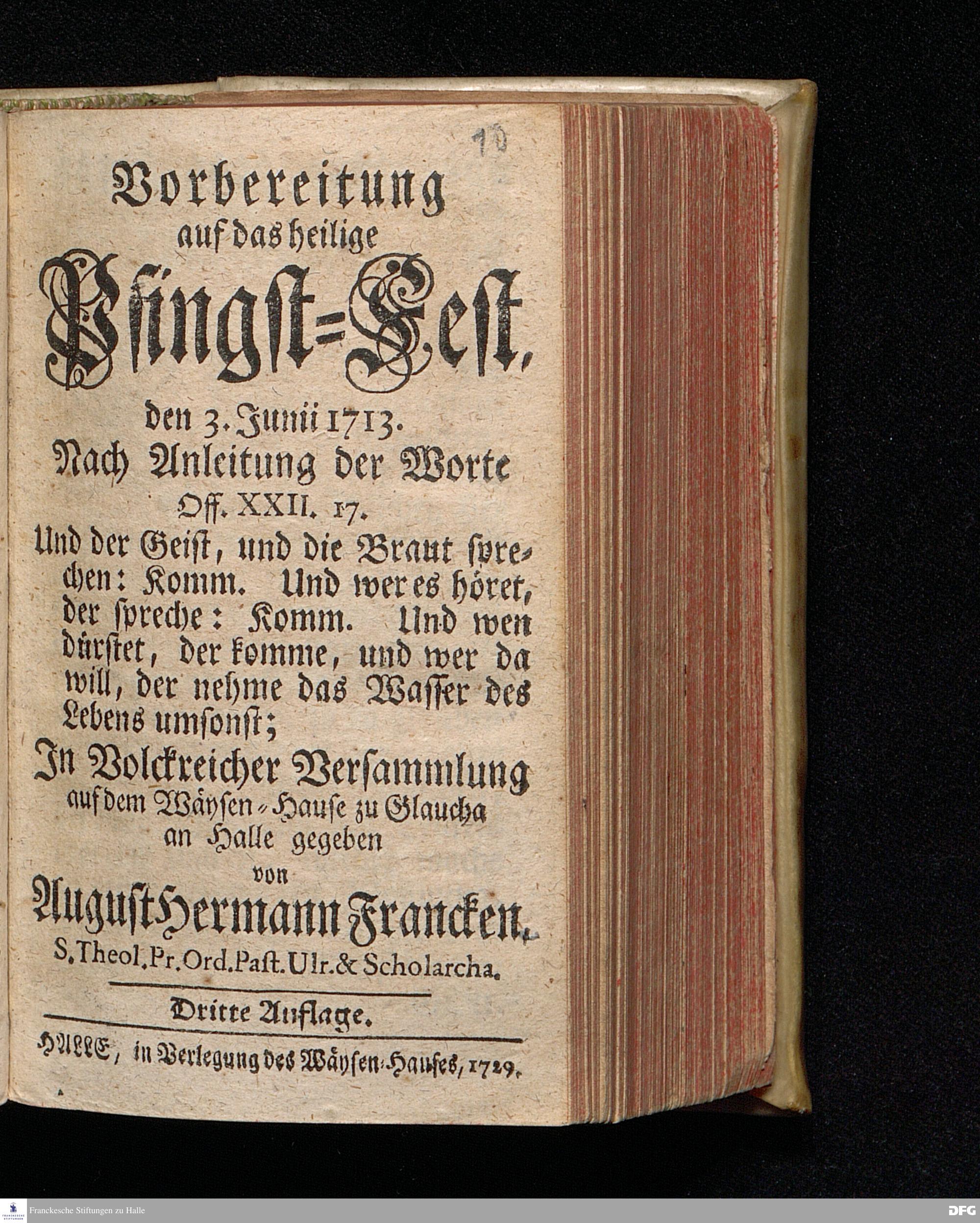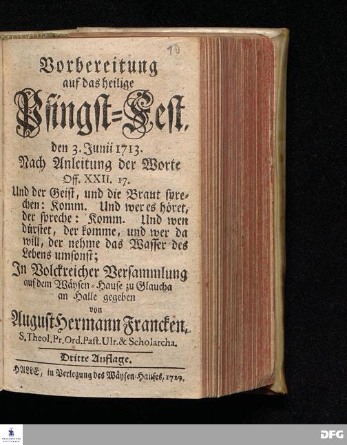 Vorbereitung auf das heilige Pfingst=Fest, den 3. Junii 1713. Nach Anleitung der Worte Off.XXII, 17. [Bibelzitat.] In Volckreicher Versammlung auf dem Wäysen=Hause zu Glaucha an Halle gegeben von August Hermann Francken, S.Theol.Pr.Ord.Past.Ulr.& Scholarcha. Dritte Auflage. HALLE, in Verlegung des Wäysen=Hauses, 1729.
