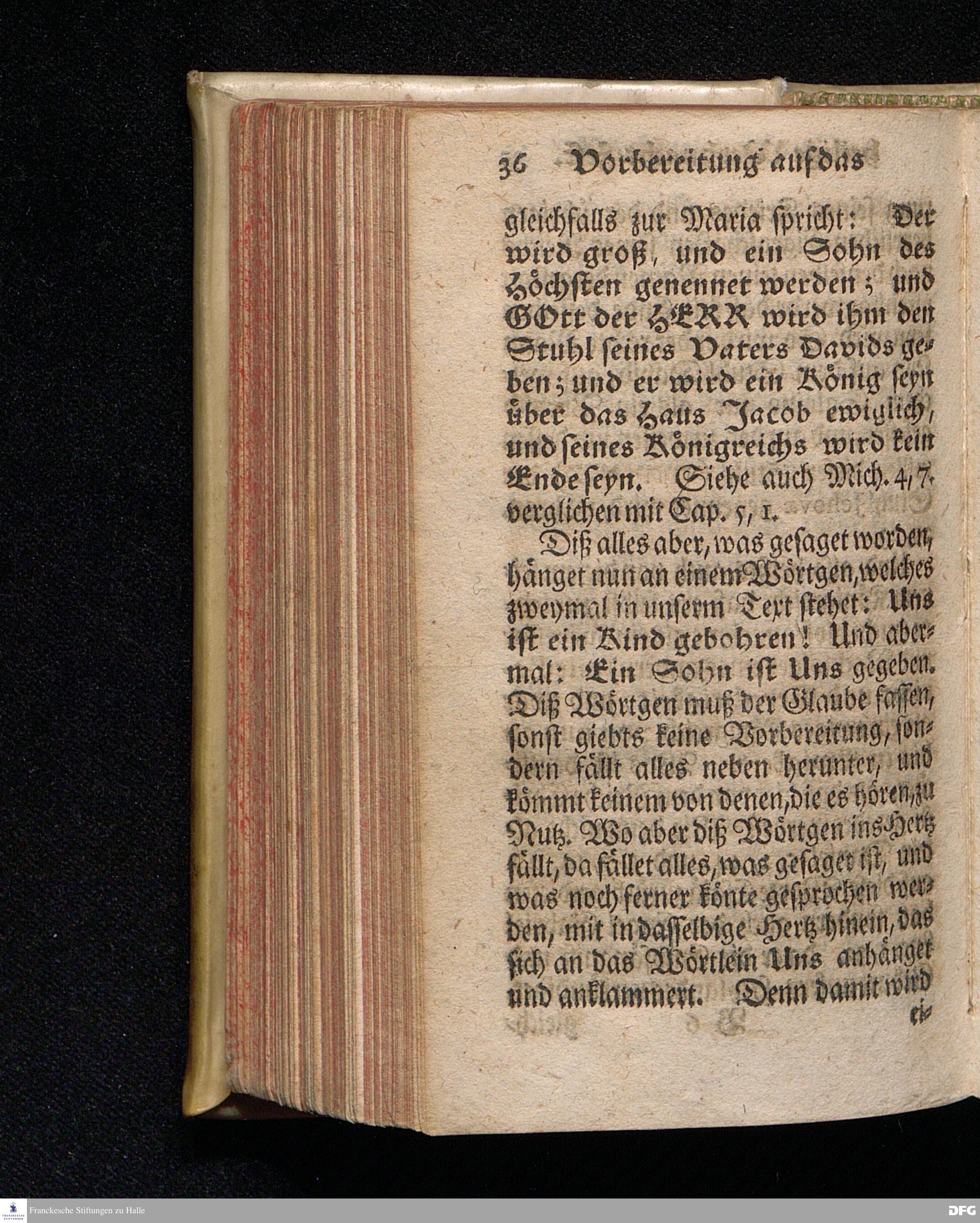 Vorbereitung auf das Weyhnacht=Fest / aus den Worten Jes.IX, 6.7. [Bibeltext;] den 23.Decembr.1720. in volckreicher Versammlung auf dem Wäysen=Hause zu Glaucha an Halle ertheilet von August Hermann Francken / S.Th.Prof.Past.Vlr.& Schol. Andere Auflage. HALLE, zu finden im Wäysen=Hause 1730.