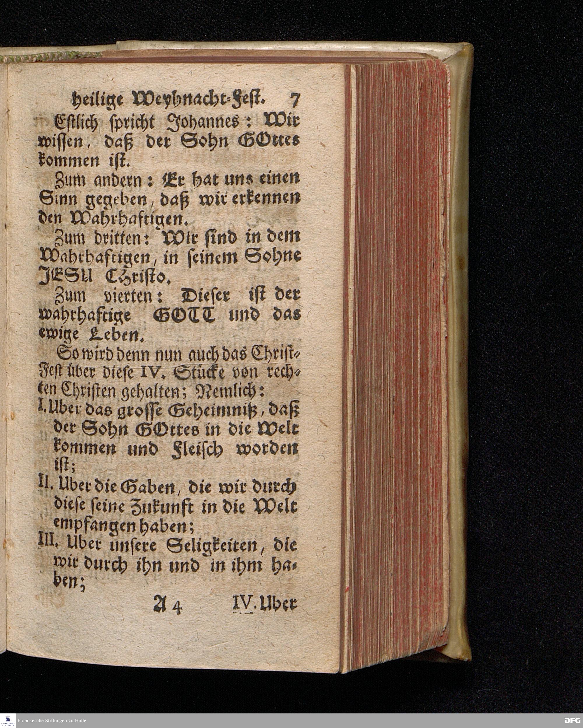 Vorbereitung auf das Weyhnacht=Fest / über die Worte 1 Joh.V, 20. [Bibelzitat;] den 22.Decembr. 1719. in Volckreicher Versammlung auf dem Wäysen=Hause zu Glaucha an Halle ertheilet von August Hermann Francken, S.Theol.Prof.Past. zu St.Ulrich, und des Gymnasii Scholarcha. Der Jugend in den Schulen des Wäysen=Hauses nach gehaltenem Examine ausgetheilet den 14.Decembr.1720. HALLE, gedr.im Wäysen=Hause. 1729.