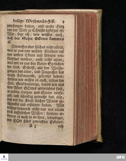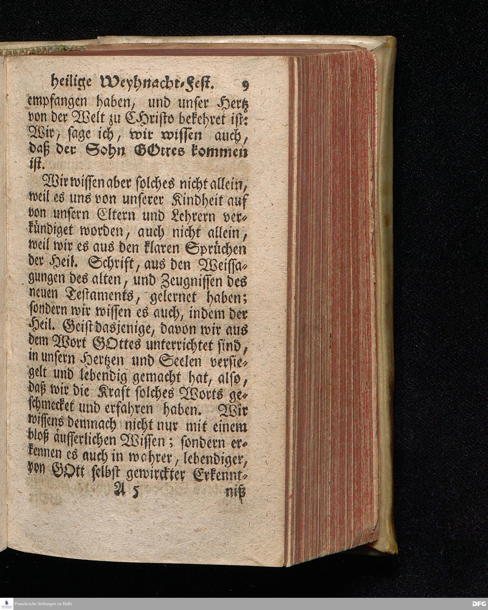 Vorbereitung auf das Weyhnacht=Fest / über die Worte 1 Joh.V, 20. [Bibelzitat;] den 22.Decembr. 1719. in Volckreicher Versammlung auf dem Wäysen=Hause zu Glaucha an Halle ertheilet von August Hermann Francken, S.Theol.Prof.Past. zu St.Ulrich, und des Gymnasii Scholarcha. Der Jugend in den Schulen des Wäysen=Hauses nach gehaltenem Examine ausgetheilet den 14.Decembr.1720. HALLE, gedr.im Wäysen=Hause. 1729.