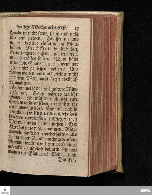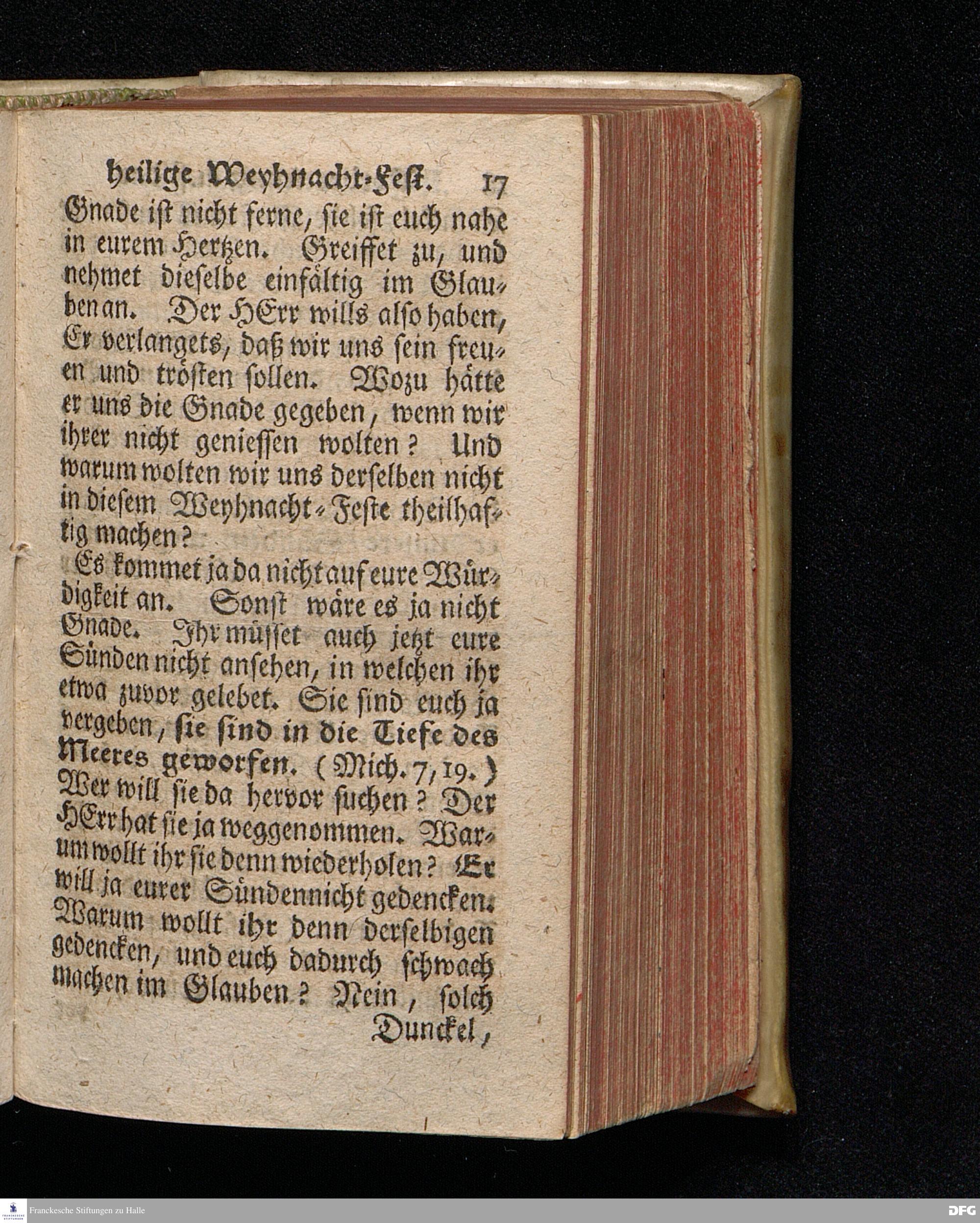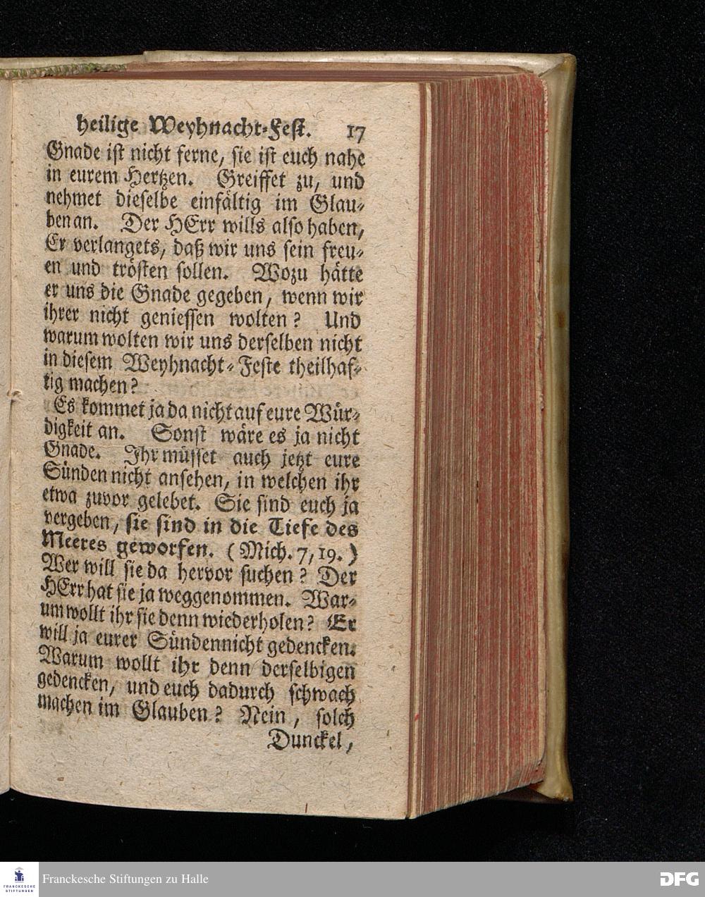 Vorbereitung auf das Weyhnacht=Fest / über die Worte 1 Joh.V, 20. [Bibelzitat;] den 22.Decembr. 1719. in Volckreicher Versammlung auf dem Wäysen=Hause zu Glaucha an Halle ertheilet von August Hermann Francken, S.Theol.Prof.Past. zu St.Ulrich, und des Gymnasii Scholarcha. Der Jugend in den Schulen des Wäysen=Hauses nach gehaltenem Examine ausgetheilet den 14.Decembr.1720. HALLE, gedr.im Wäysen=Hause. 1729.