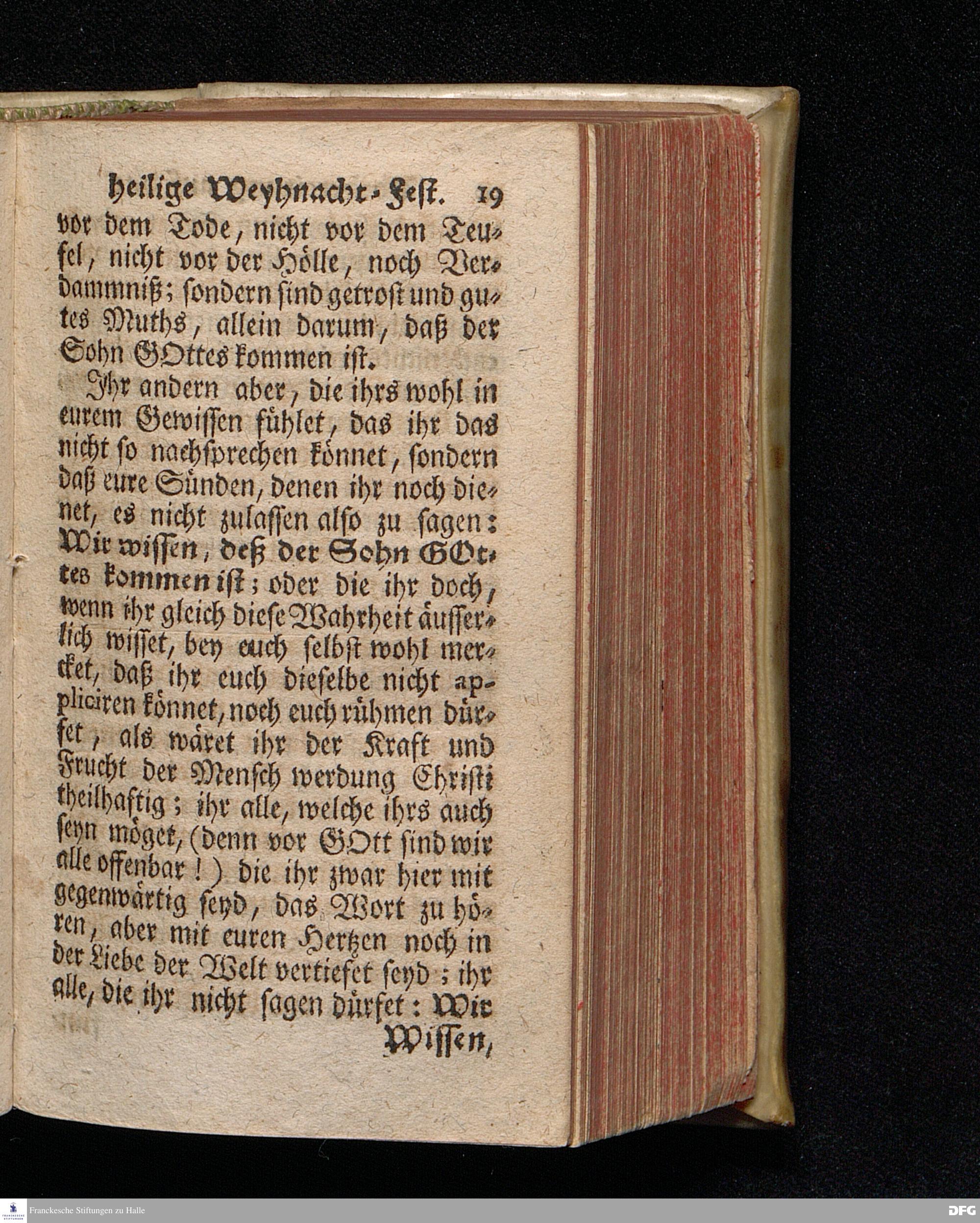 Vorbereitung auf das Weyhnacht=Fest / über die Worte 1 Joh.V, 20. [Bibelzitat;] den 22.Decembr. 1719. in Volckreicher Versammlung auf dem Wäysen=Hause zu Glaucha an Halle ertheilet von August Hermann Francken, S.Theol.Prof.Past. zu St.Ulrich, und des Gymnasii Scholarcha. Der Jugend in den Schulen des Wäysen=Hauses nach gehaltenem Examine ausgetheilet den 14.Decembr.1720. HALLE, gedr.im Wäysen=Hause. 1729.