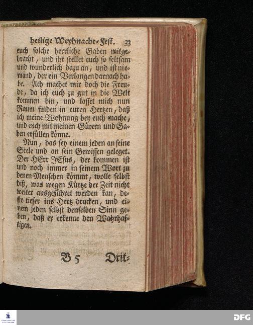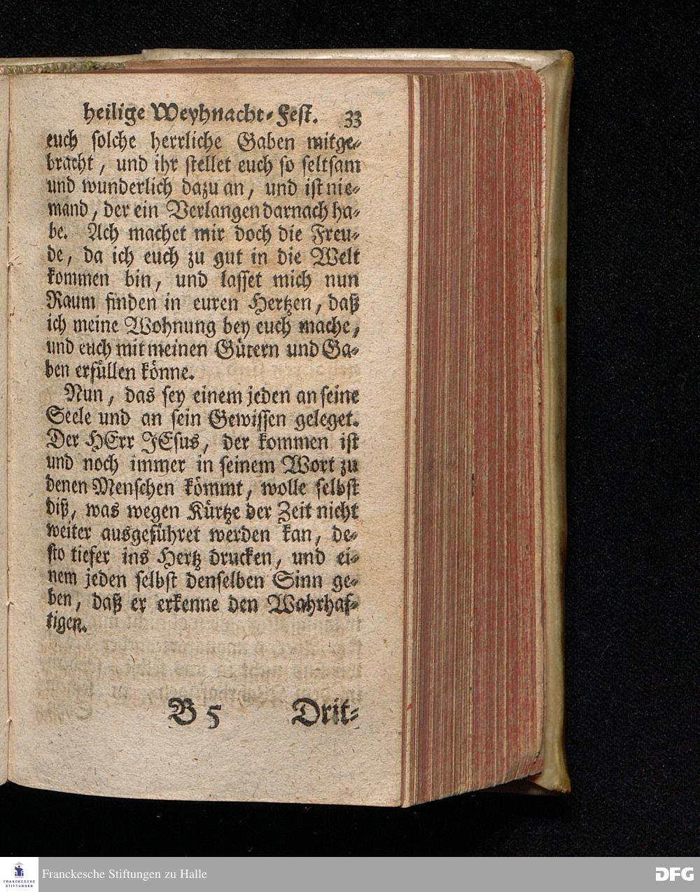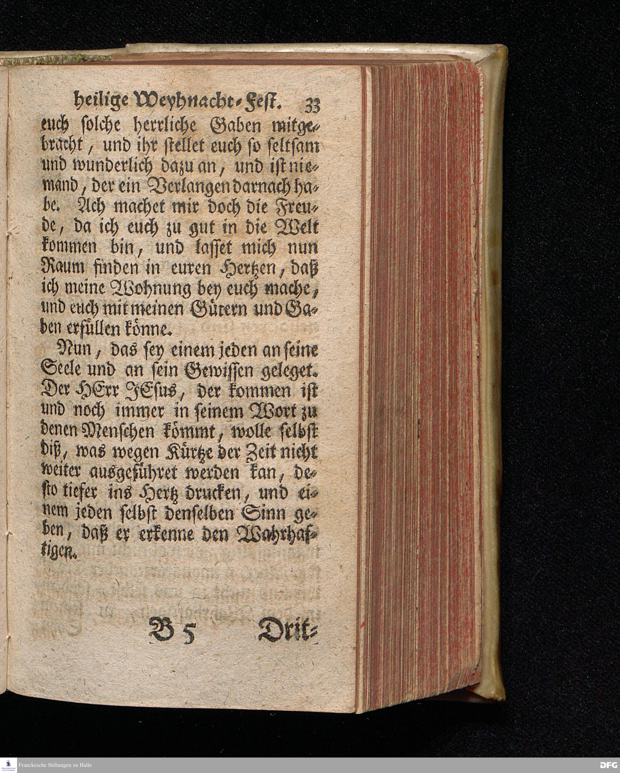 Vorbereitung auf das Weyhnacht=Fest / über die Worte 1 Joh.V, 20. [Bibelzitat;] den 22.Decembr. 1719. in Volckreicher Versammlung auf dem Wäysen=Hause zu Glaucha an Halle ertheilet von August Hermann Francken, S.Theol.Prof.Past. zu St.Ulrich, und des Gymnasii Scholarcha. Der Jugend in den Schulen des Wäysen=Hauses nach gehaltenem Examine ausgetheilet den 14.Decembr.1720. HALLE, gedr.im Wäysen=Hause. 1729.
