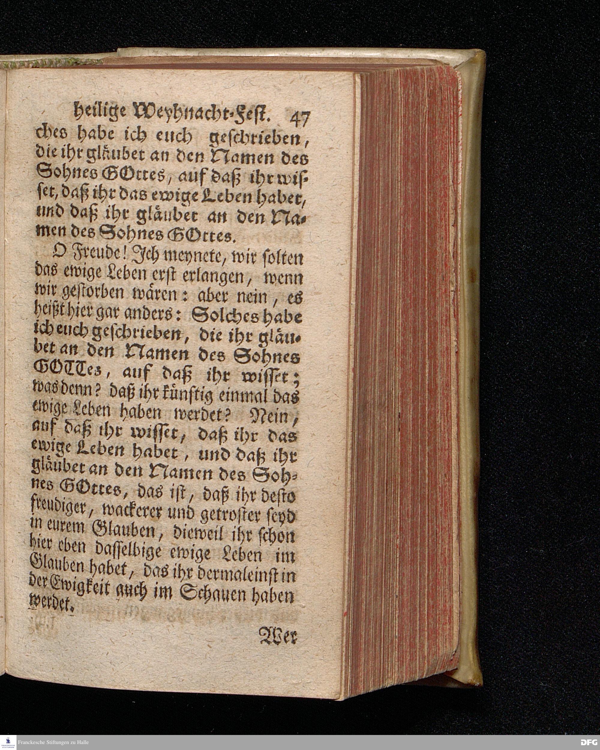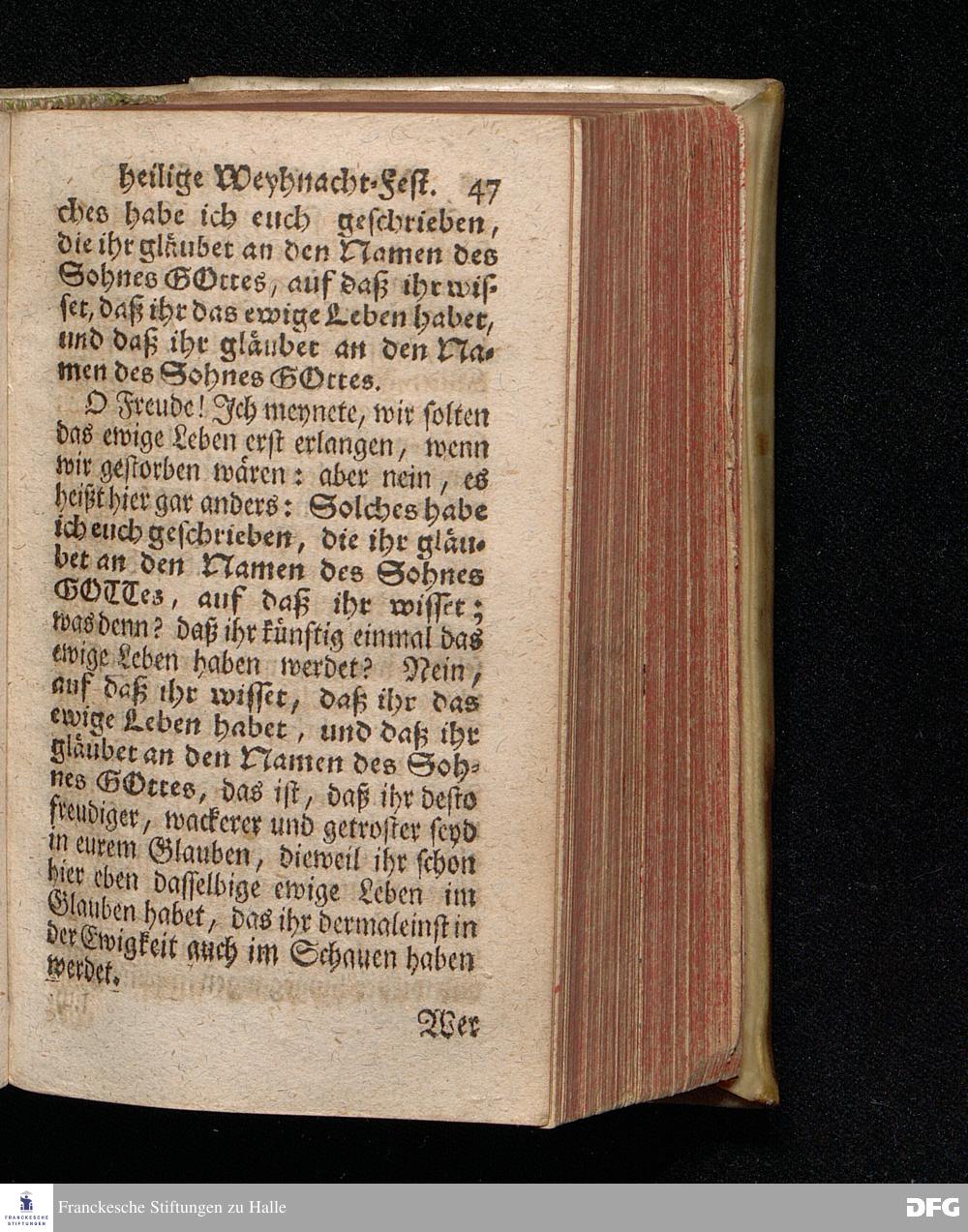 Vorbereitung auf das Weyhnacht=Fest / über die Worte 1 Joh.V, 20. [Bibelzitat;] den 22.Decembr. 1719. in Volckreicher Versammlung auf dem Wäysen=Hause zu Glaucha an Halle ertheilet von August Hermann Francken, S.Theol.Prof.Past. zu St.Ulrich, und des Gymnasii Scholarcha. Der Jugend in den Schulen des Wäysen=Hauses nach gehaltenem Examine ausgetheilet den 14.Decembr.1720. HALLE, gedr.im Wäysen=Hause. 1729.