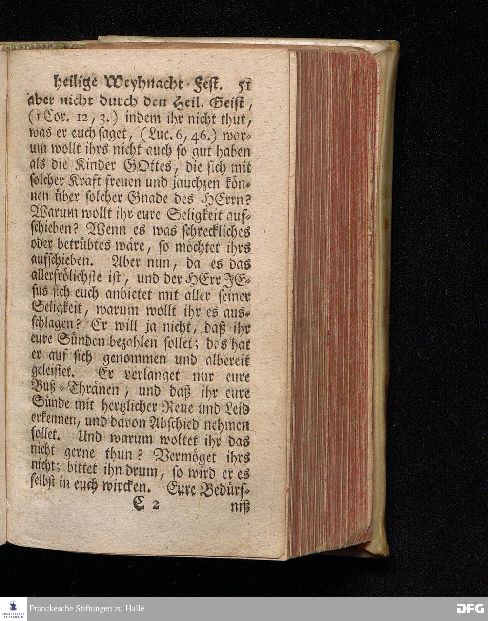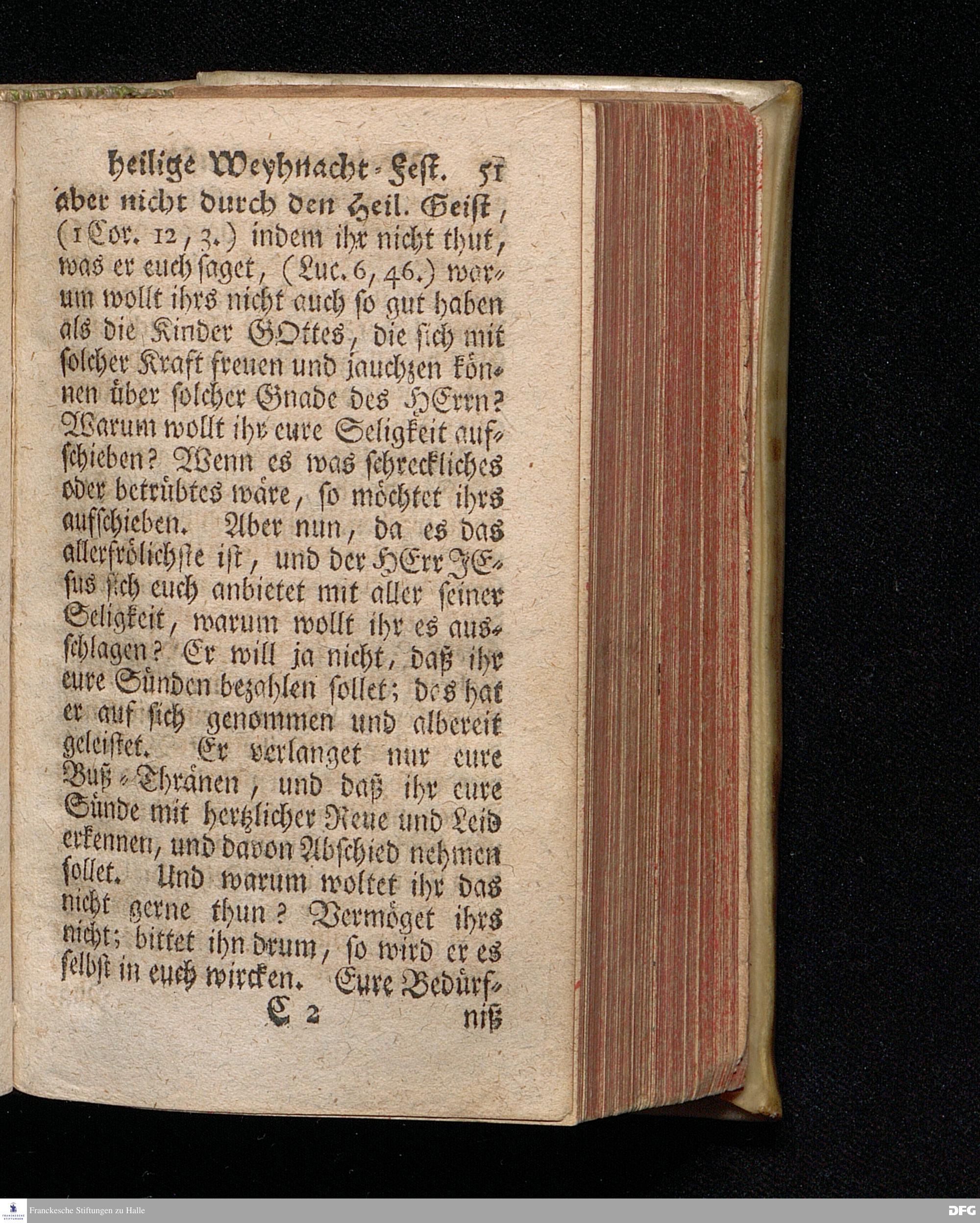 Vorbereitung auf das Weyhnacht=Fest / über die Worte 1 Joh.V, 20. [Bibelzitat;] den 22.Decembr. 1719. in Volckreicher Versammlung auf dem Wäysen=Hause zu Glaucha an Halle ertheilet von August Hermann Francken, S.Theol.Prof.Past. zu St.Ulrich, und des Gymnasii Scholarcha. Der Jugend in den Schulen des Wäysen=Hauses nach gehaltenem Examine ausgetheilet den 14.Decembr.1720. HALLE, gedr.im Wäysen=Hause. 1729.