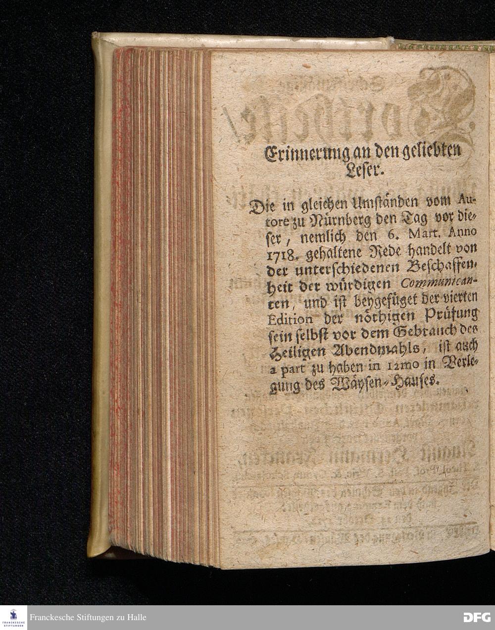 Schriftmäßige Vortheile / deren man sich in der Ubung des wahren thätigen Christenthums, Und in dem von GOTT darinnen anbefohlnen Wachsthum unter göttlichem Segen mit Nutzen bedienen kan, Wie solche bey dem Wohl=Ehrw. Herrn Ambrosio Wirthen, Suden=Prediger im neuen Spital zum H.Geist, zu Nürnberg, einigen bey demselben gewöhnlicher massen versammleten Christlichen Personen den 7.Mart.Anno 1718.dem Innhalt nach vorgestellet worden von August Hermann Francken, S.Theol.Prof.Past.S.Vlric.& Gymn.Scholarcha. Der Jugend in den Schulen des Wäysen=Hauses nach dem Examine ausgetheilet den 24.Octobr.1722. HALLE, in Verlegung des Wäysen=Hauses, 1729.