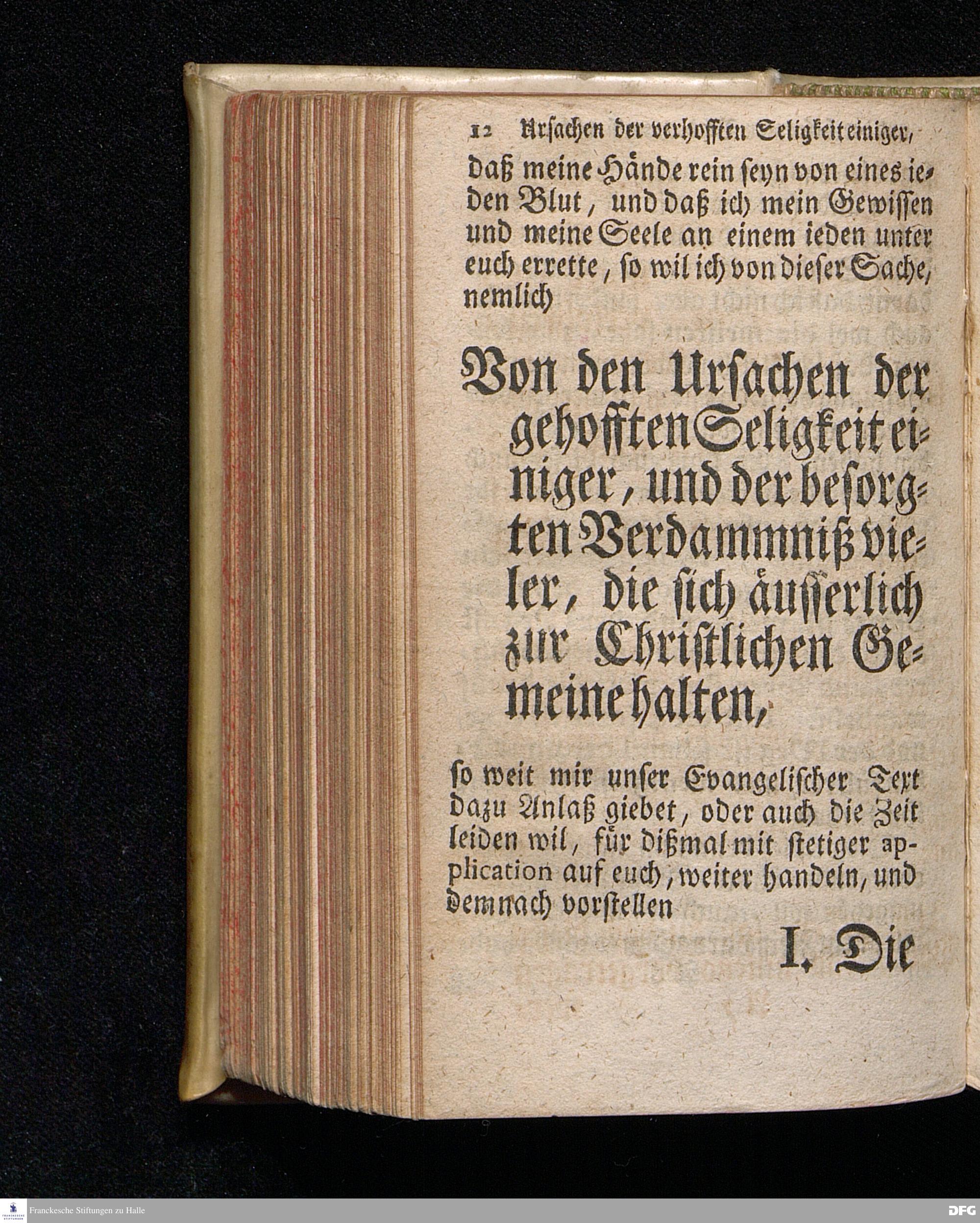Die Ursachen der gehofften Seligkeit einiger, Und der besorgten Verdammniß vieler, Die sich äusserlich zur Christlichen Gemeine halten / Am andern Pfingst=Feyertage 1718. nach Anleitung des Evangel.Textes Joh.III, 16-21. In der S.Ulrichs=Kirche in Halle / mit stetiger Application auf die Zuhörer vorgestellet von August Hermann Francken / S.Th.Prof.& Past.zu S.Ulrich, und des Gymnasii Scholarcha. Andere Auflage. Der Jugend in den Schulen des Wäysenhauses, nach gehaltenem Examine, den 18.Jun. gedachten Jahrs, ausgetheilet. Halle, in Verlegung des Wäysenhauses. 1723.