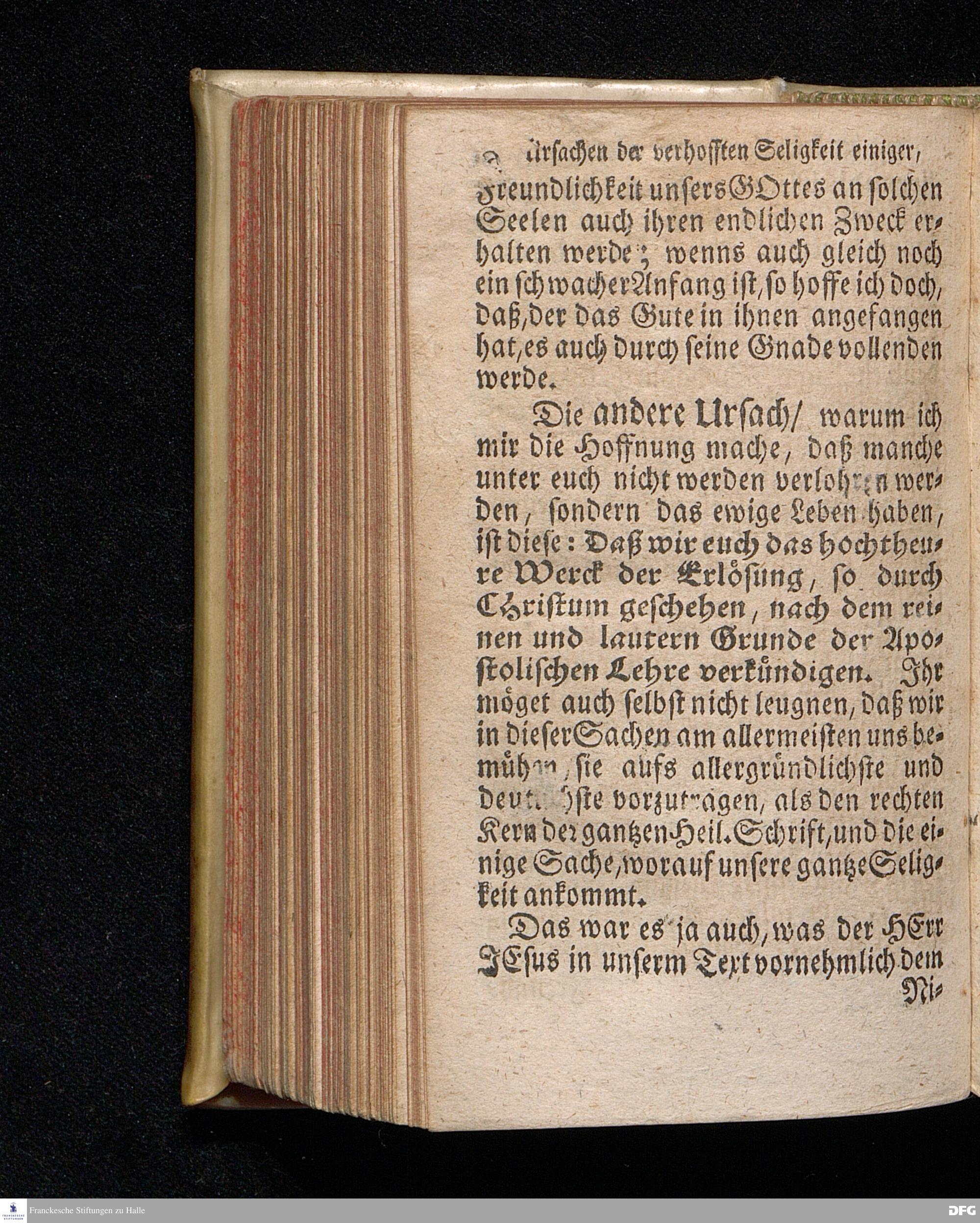 Die Ursachen der gehofften Seligkeit einiger, Und der besorgten Verdammniß vieler, Die sich äusserlich zur Christlichen Gemeine halten / Am andern Pfingst=Feyertage 1718. nach Anleitung des Evangel.Textes Joh.III, 16-21. In der S.Ulrichs=Kirche in Halle / mit stetiger Application auf die Zuhörer vorgestellet von August Hermann Francken / S.Th.Prof.& Past.zu S.Ulrich, und des Gymnasii Scholarcha. Andere Auflage. Der Jugend in den Schulen des Wäysenhauses, nach gehaltenem Examine, den 18.Jun. gedachten Jahrs, ausgetheilet. Halle, in Verlegung des Wäysenhauses. 1723.