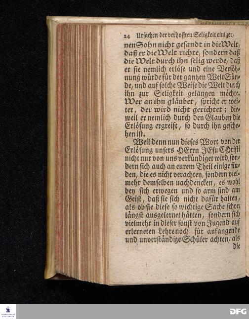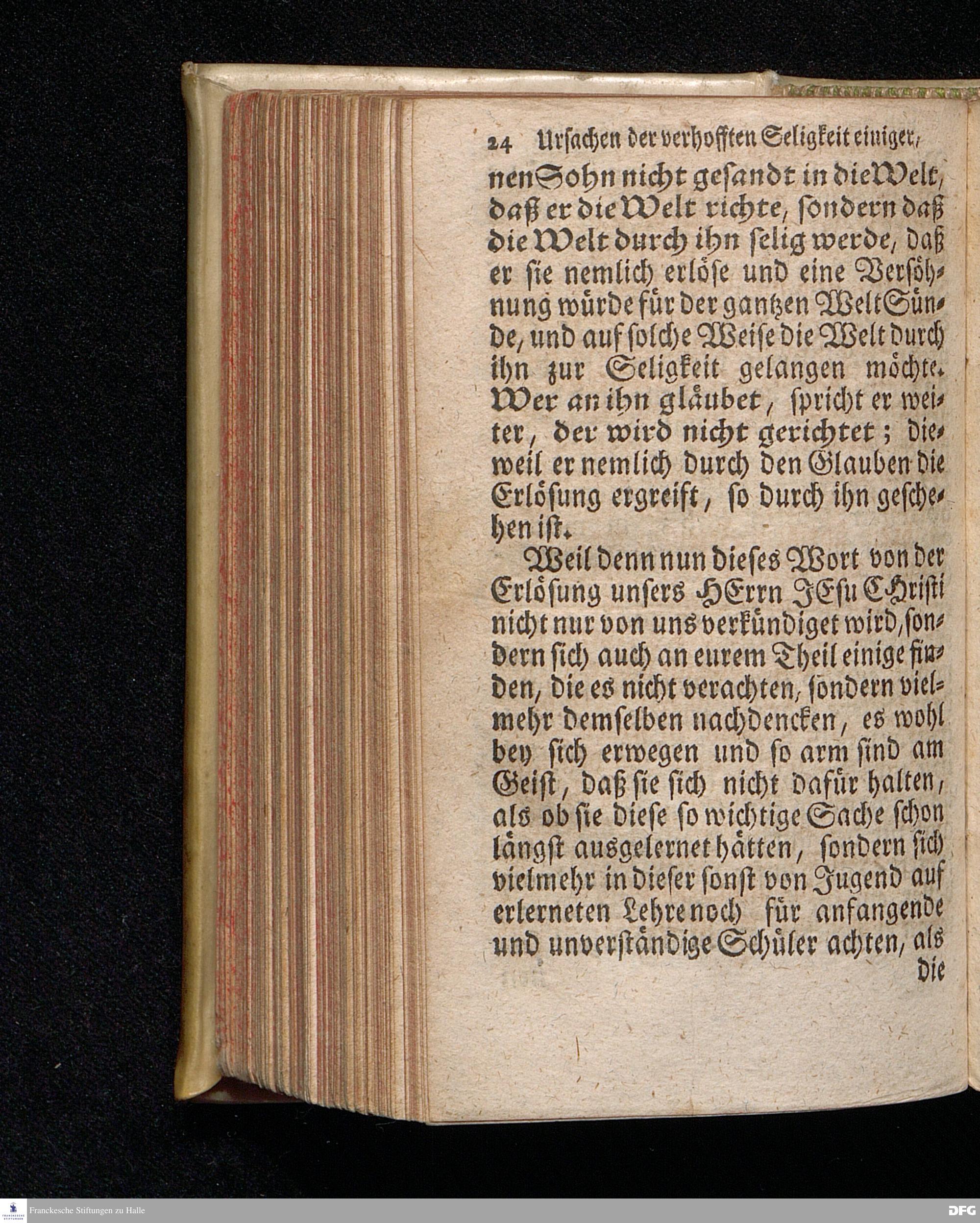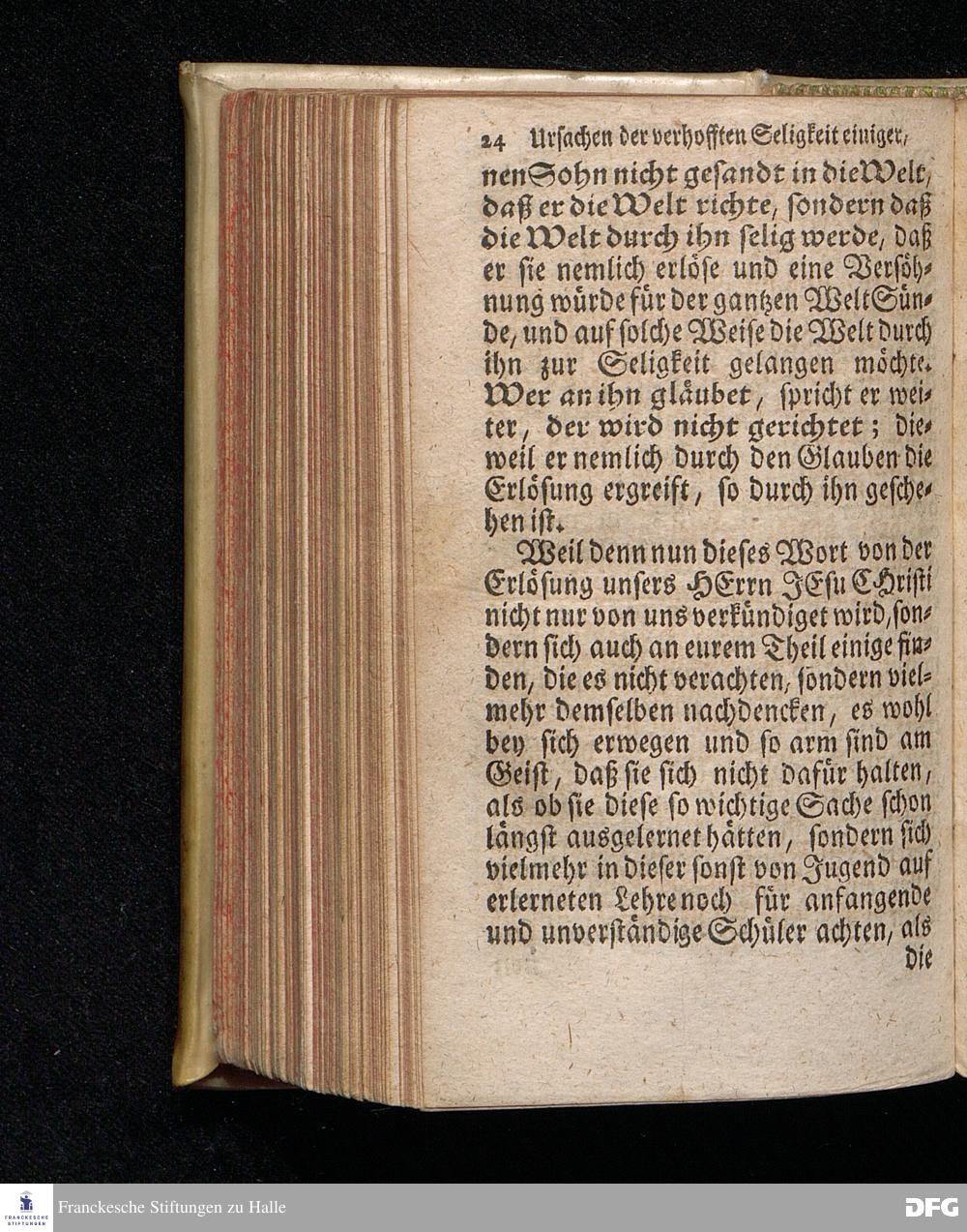 Die Ursachen der gehofften Seligkeit einiger, Und der besorgten Verdammniß vieler, Die sich äusserlich zur Christlichen Gemeine halten / Am andern Pfingst=Feyertage 1718. nach Anleitung des Evangel.Textes Joh.III, 16-21. In der S.Ulrichs=Kirche in Halle / mit stetiger Application auf die Zuhörer vorgestellet von August Hermann Francken / S.Th.Prof.& Past.zu S.Ulrich, und des Gymnasii Scholarcha. Andere Auflage. Der Jugend in den Schulen des Wäysenhauses, nach gehaltenem Examine, den 18.Jun. gedachten Jahrs, ausgetheilet. Halle, in Verlegung des Wäysenhauses. 1723.