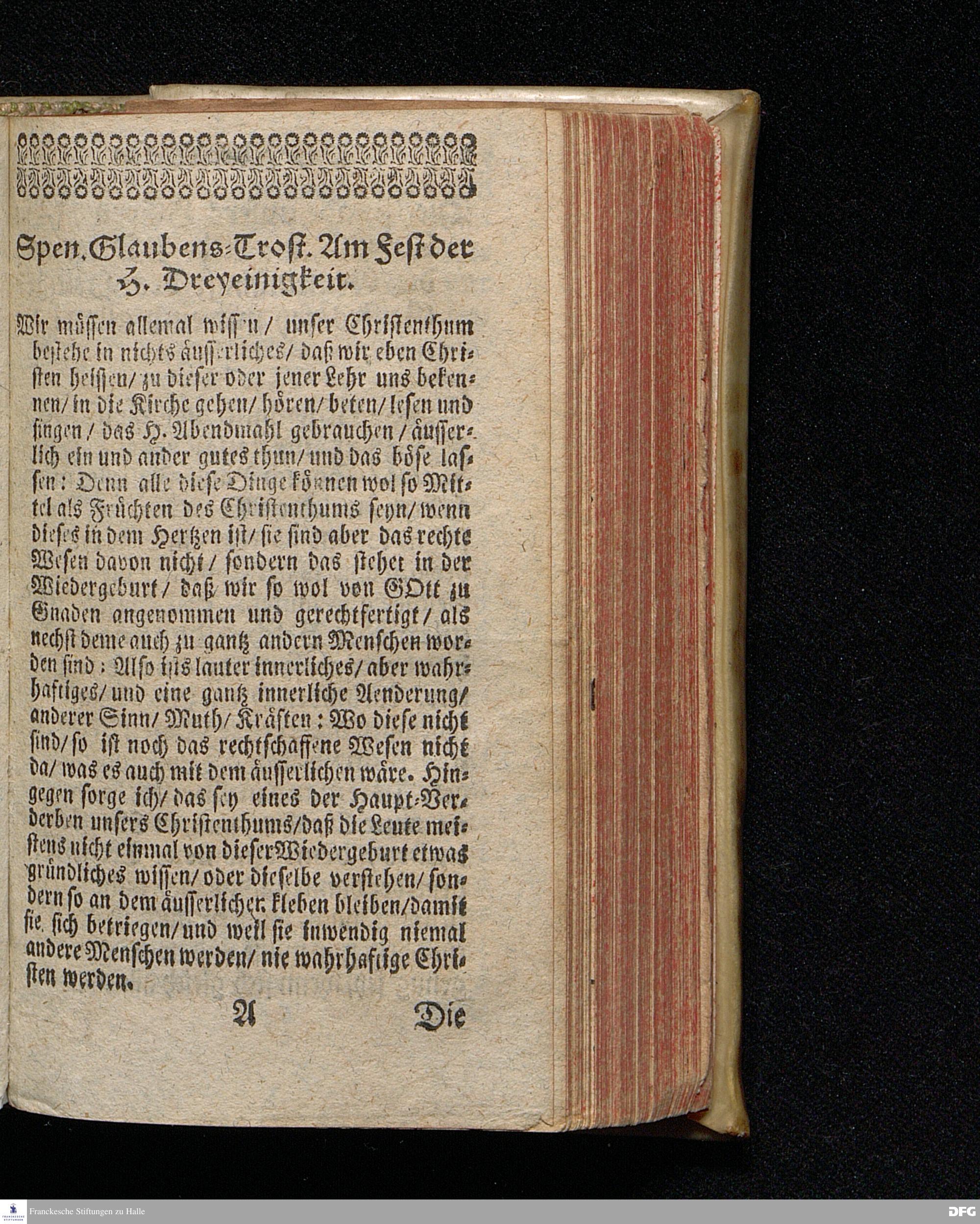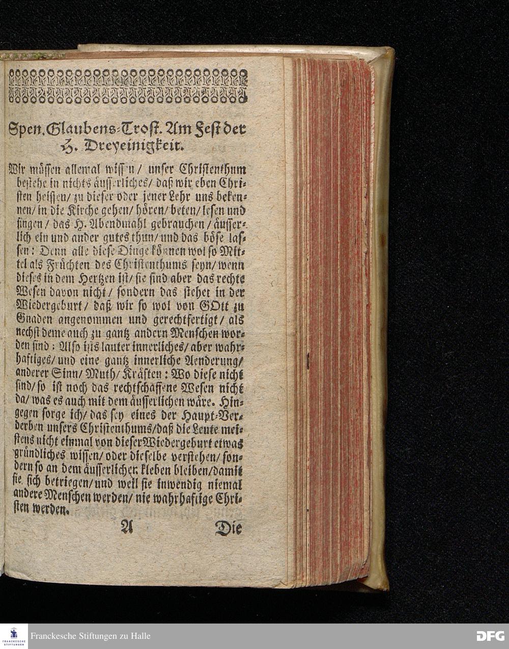Das Rechte Wesen Des Christenthums, Aus dem Evangelischen Text Joh.III, 1-15. Am Fest der H.Dreyeinigkeit 1714. In der St.Georgen=Kirche zu Glaucha an Halle vorgestellet von August Hermann Francken / S.Theol.Prof.Ord.& Past. Andere Auflage. HALLE / In Verlegung des Wäysen=Hauses. 1729.