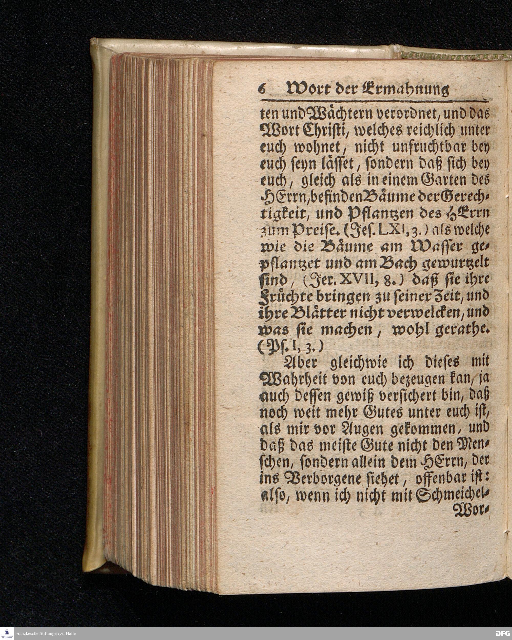 Ein Wort der Ermahnung und des Trostes An Die in einer namhaften Stadt Befindliche GOtt suchende und GOtt liebende oder doch von der Wahrheit die in Christo JEsu ist, wenigstens einiger Massen, überzeugte Seelen / aus Christlichem Wohlmeynen, nach einigem Aufenthalt daselbst, abgelassen aus Halle den 7.Jan.1710. von August Hermann Francken. Andere Auflage. [Bibelzitat.] HALLE, In Verlegung des Wäysenhauses. 1723.