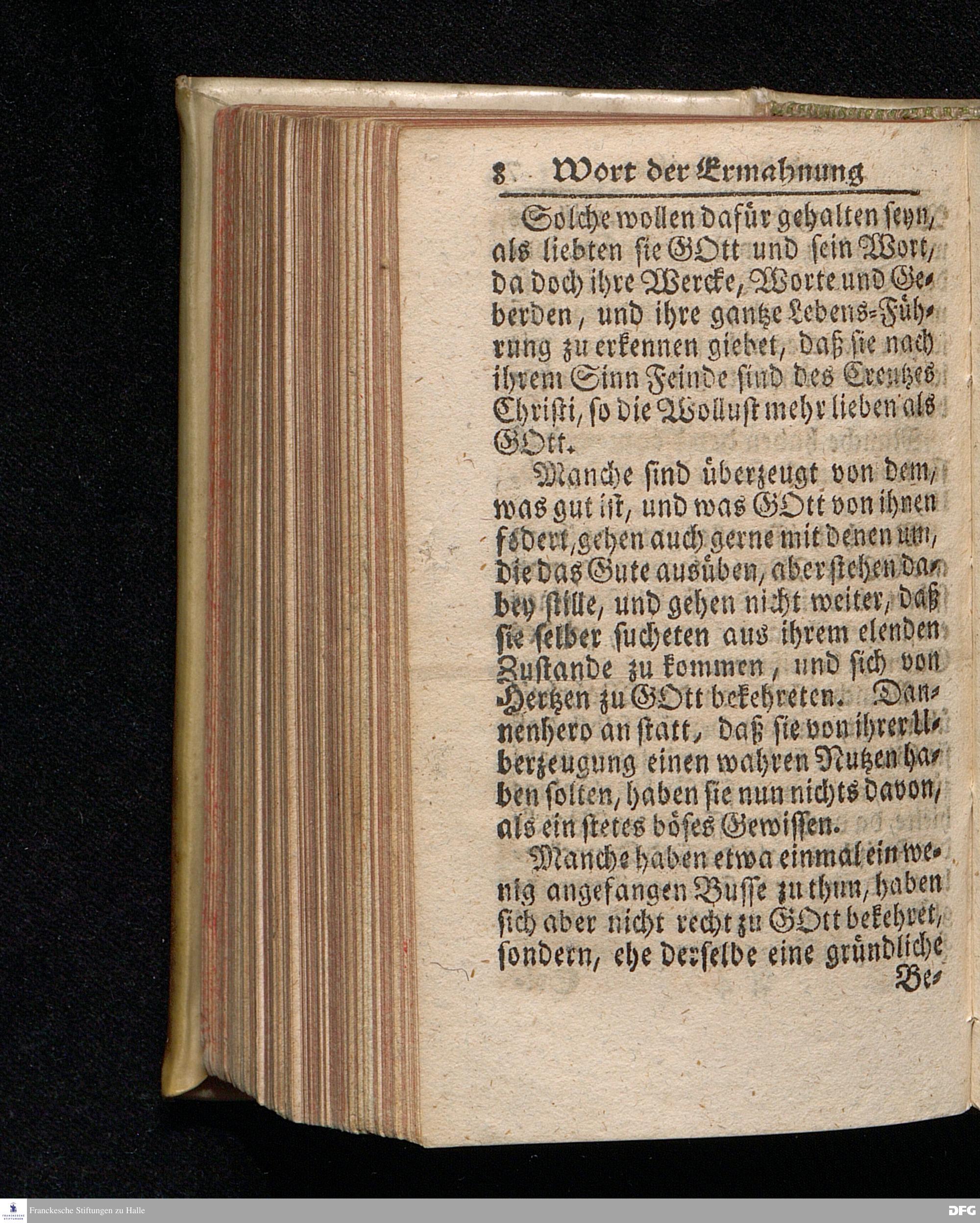 Ein Wort der Ermahnung und des Trostes An Die in einer namhaften Stadt Befindliche GOtt suchende und GOtt liebende oder doch von der Wahrheit die in Christo JEsu ist, wenigstens einiger Massen, überzeugte Seelen / aus Christlichem Wohlmeynen, nach einigem Aufenthalt daselbst, abgelassen aus Halle den 7.Jan.1710. von August Hermann Francken. Andere Auflage. [Bibelzitat.] HALLE, In Verlegung des Wäysenhauses. 1723.