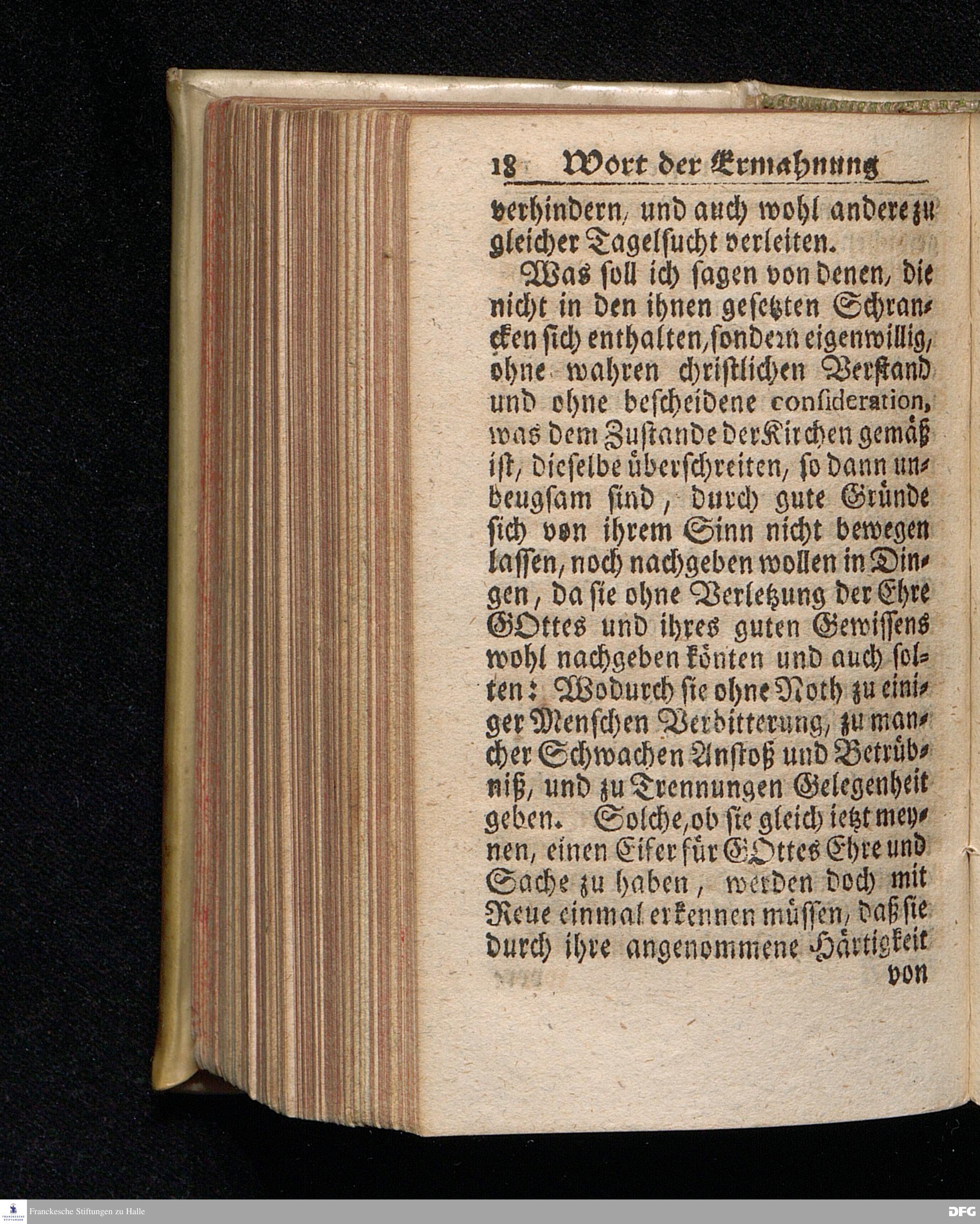 Ein Wort der Ermahnung und des Trostes An Die in einer namhaften Stadt Befindliche GOtt suchende und GOtt liebende oder doch von der Wahrheit die in Christo JEsu ist, wenigstens einiger Massen, überzeugte Seelen / aus Christlichem Wohlmeynen, nach einigem Aufenthalt daselbst, abgelassen aus Halle den 7.Jan.1710. von August Hermann Francken. Andere Auflage. [Bibelzitat.] HALLE, In Verlegung des Wäysenhauses. 1723.