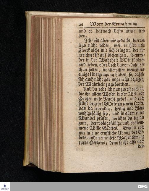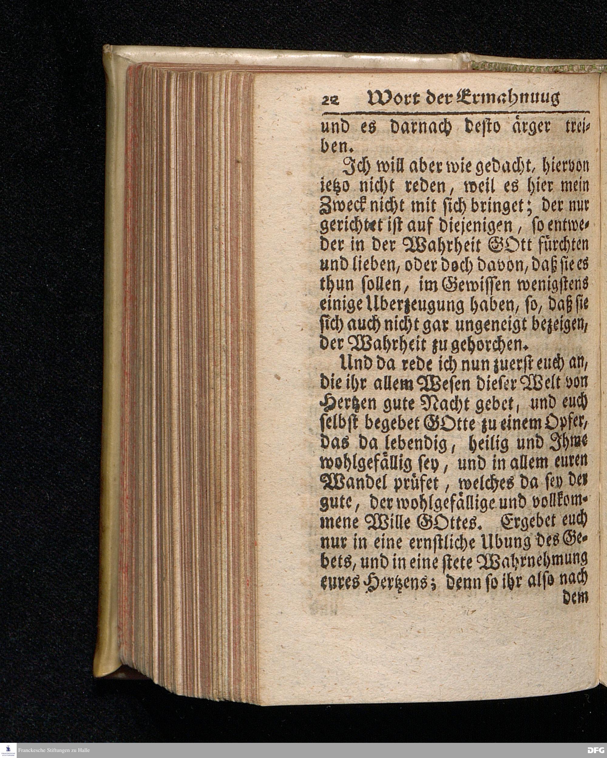 Ein Wort der Ermahnung und des Trostes An Die in einer namhaften Stadt Befindliche GOtt suchende und GOtt liebende oder doch von der Wahrheit die in Christo JEsu ist, wenigstens einiger Massen, überzeugte Seelen / aus Christlichem Wohlmeynen, nach einigem Aufenthalt daselbst, abgelassen aus Halle den 7.Jan.1710. von August Hermann Francken. Andere Auflage. [Bibelzitat.] HALLE, In Verlegung des Wäysenhauses. 1723.
