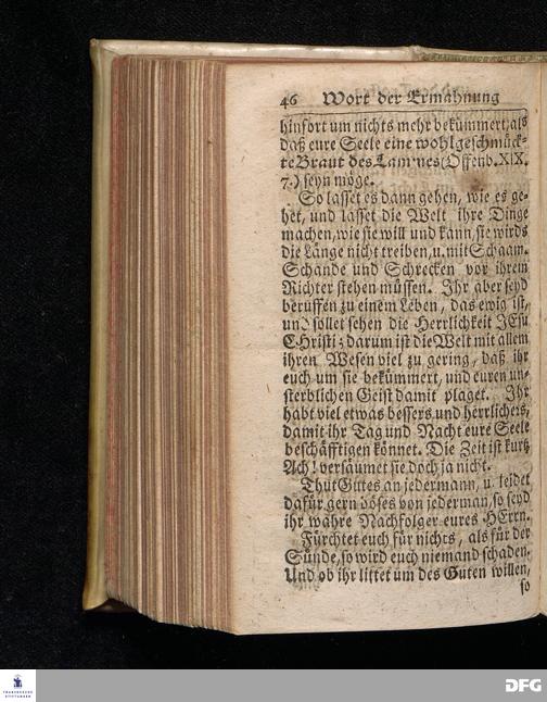 Ein Wort der Ermahnung und des Trostes An Die in einer namhaften Stadt Befindliche GOtt suchende und GOtt liebende oder doch von der Wahrheit die in Christo JEsu ist, wenigstens einiger Massen, überzeugte Seelen / aus Christlichem Wohlmeynen, nach einigem Aufenthalt daselbst, abgelassen aus Halle den 7.Jan.1710. von August Hermann Francken. Andere Auflage. [Bibelzitat.] HALLE, In Verlegung des Wäysenhauses. 1723.