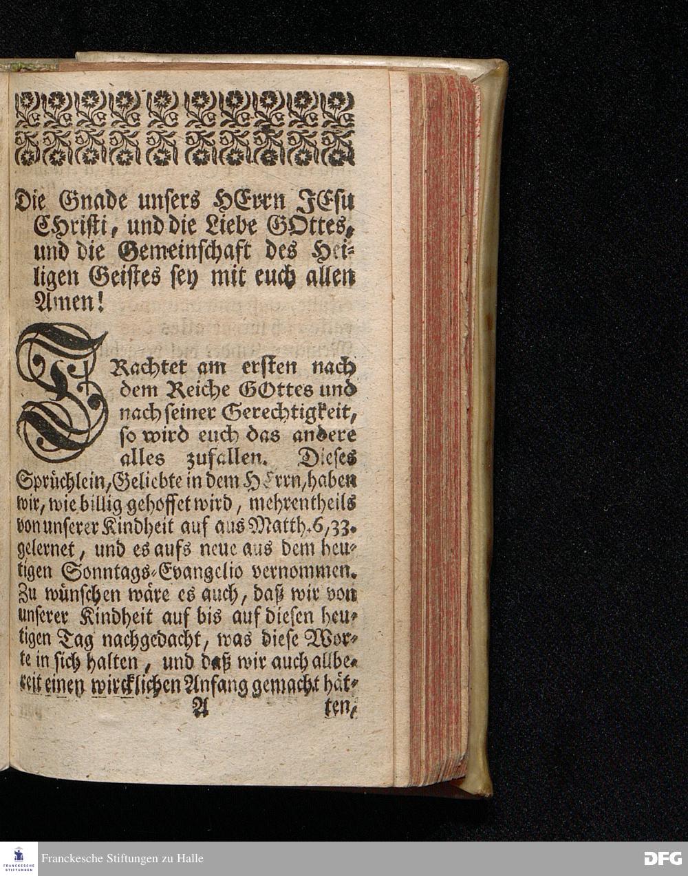 Das Zeitliche Leben als eine Saat=Zeit / In einer Predigt über Galat.VI, 7.8. Am XV.Sonntage nach Trinit. Anno 1709. In der Schul=Kirche zu Halle / vorgestellet von Aug.Herrm.[!] Francken / S.Th.Prof.Ord.und Past. Dritte Auflage. HALLE, In Verlegung des Wäysenhauses. MDCCXXIX.