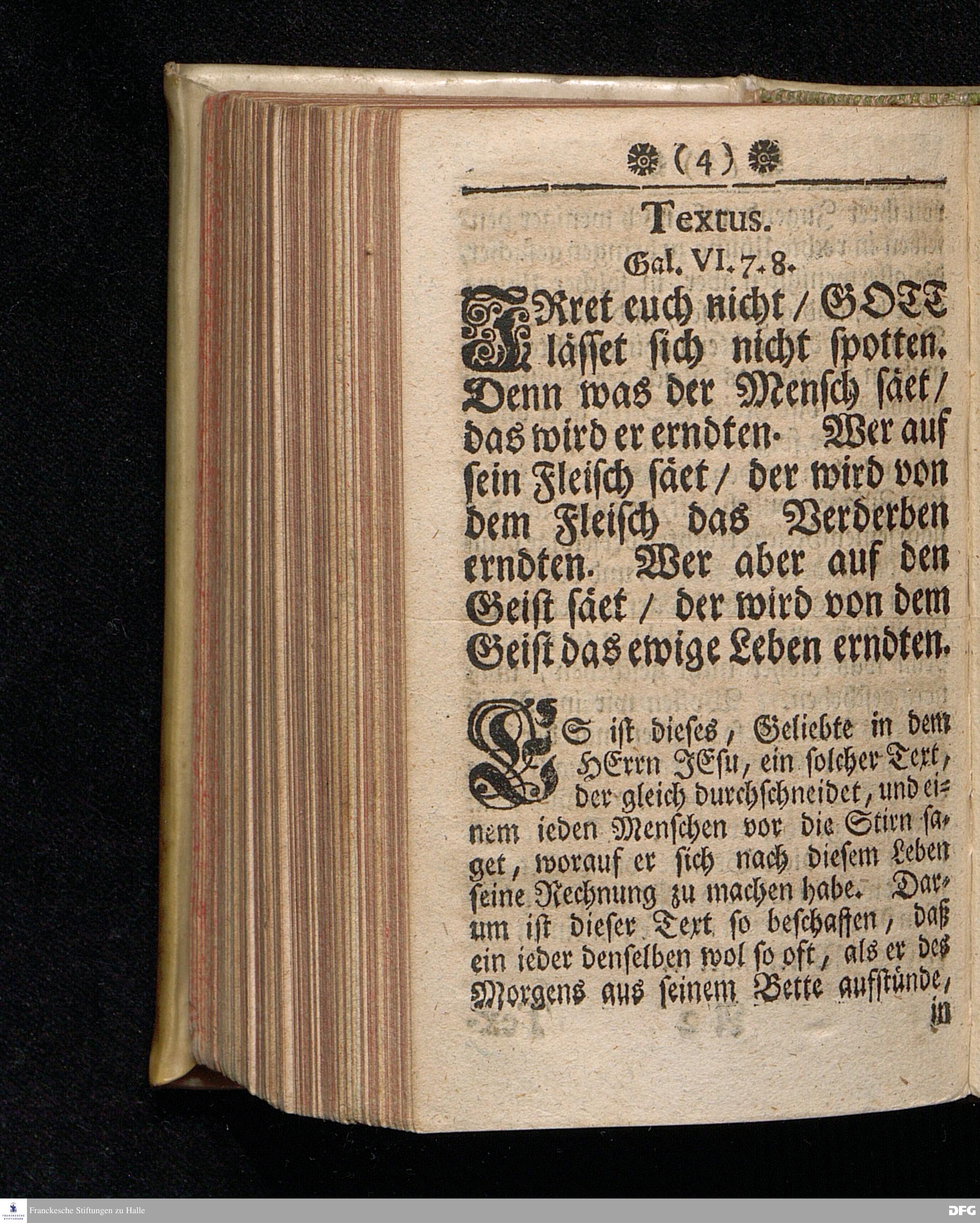 Das Zeitliche Leben als eine Saat=Zeit / In einer Predigt über Galat.VI, 7.8. Am XV.Sonntage nach Trinit. Anno 1709. In der Schul=Kirche zu Halle / vorgestellet von Aug.Herrm.[!] Francken / S.Th.Prof.Ord.und Past. Dritte Auflage. HALLE, In Verlegung des Wäysenhauses. MDCCXXIX.